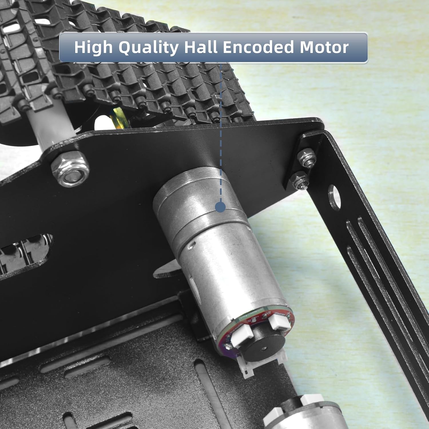 - 【High strength robot tank base】This is an agile tracked chassis, low noise and easy to control, which is a good partner for you to learning robotics.The robot chassis uses high strength aluminum alloy which makes it extremely solid and durable. The top bracket can be disassembled at will, so that you can achieve more expansion.