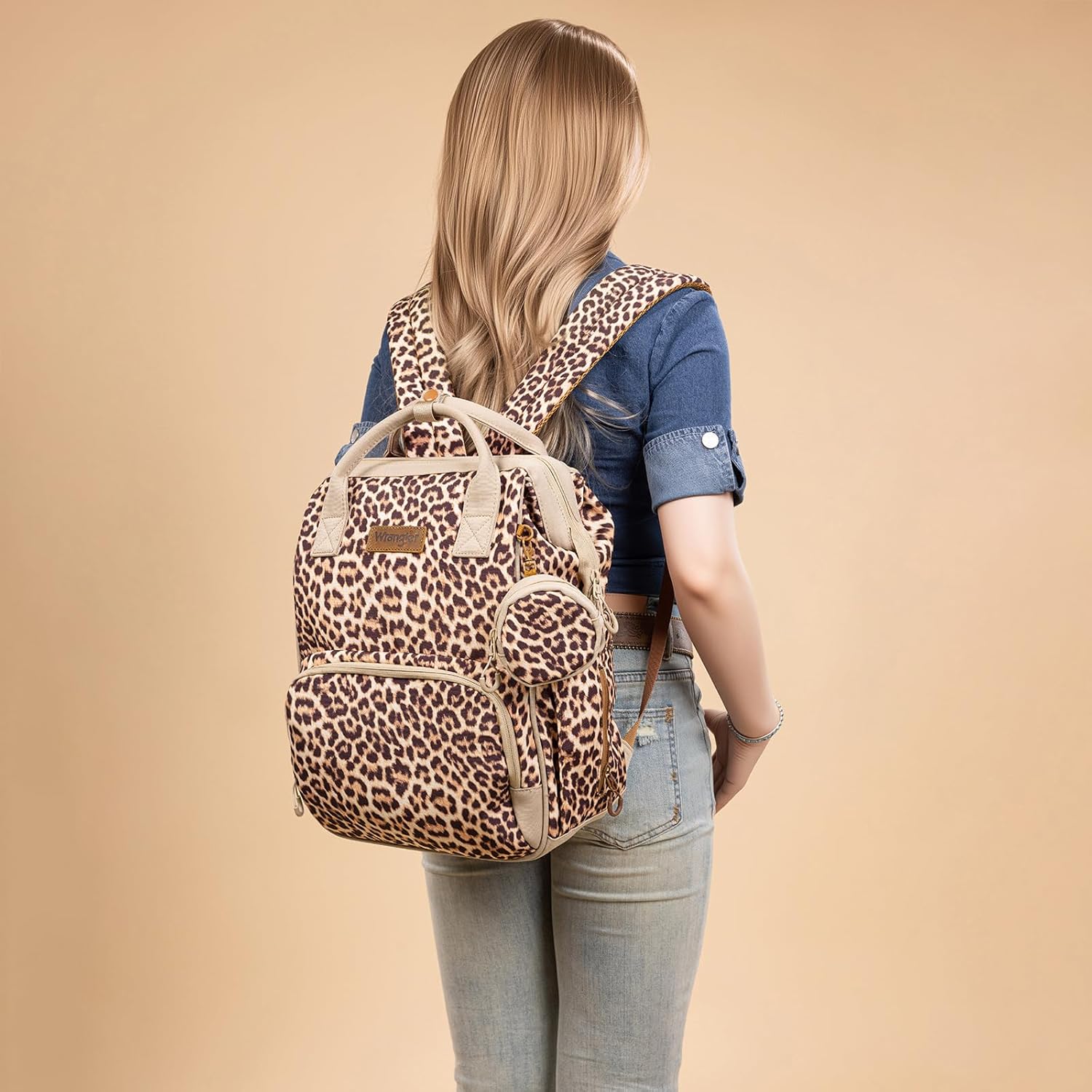 Wrangler Leopard Print Backpack Multifunction Baby Travel Bag with Changing Pad, Stroller Straps and Pacifier Case WG2204-91103LP-BR