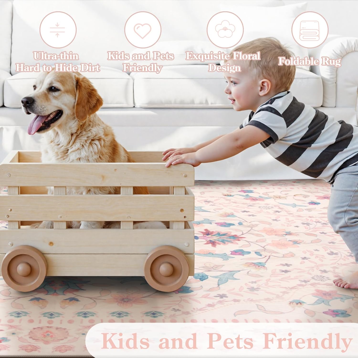 Wonnitar Boho Floral 8x10 Pink Area Rug, Washable Kids Rugs for Bedroom, Large Ultra-Thin Soft Non Slip Carpet for Nursery Living Room Playroom Classroom, Pastel Pink