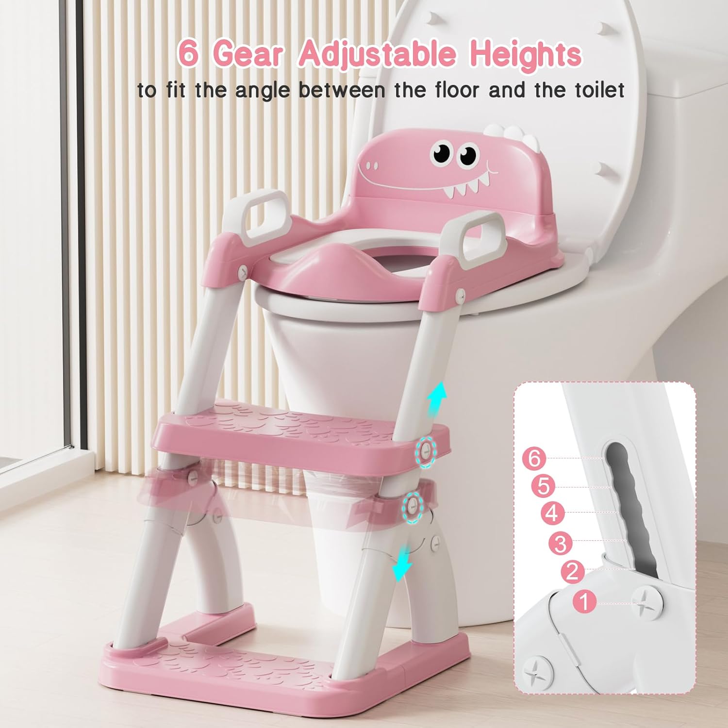 - ✅[ADJUSTABLE HEIGHT AND FOLABLE ]: Our toddler toilet seat with steps has 6 adjustable heights which ensures that it fits 99.99% shape and highs of all toilets (like V/U/O shape. NOT for square), the foldable design allows it maximize the space-saving when not in use and keep everything in order.