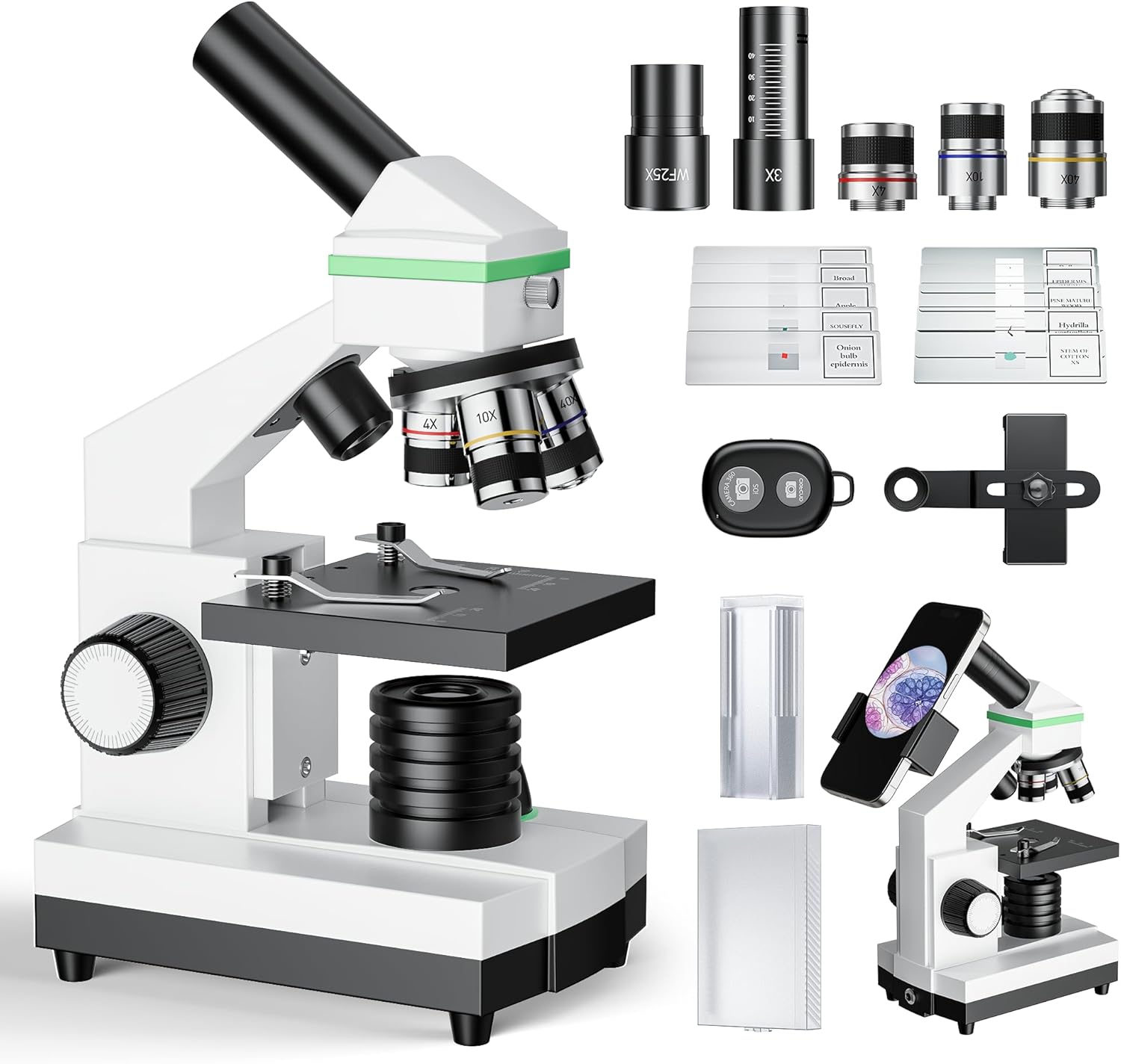 - 【Complete accessories】Comes with an instruction manual and a microscope exploration kit, so even children and beginners can use it easily. The microscope is equipped with a phone holder for easy viewing and capturing of photos or videos.