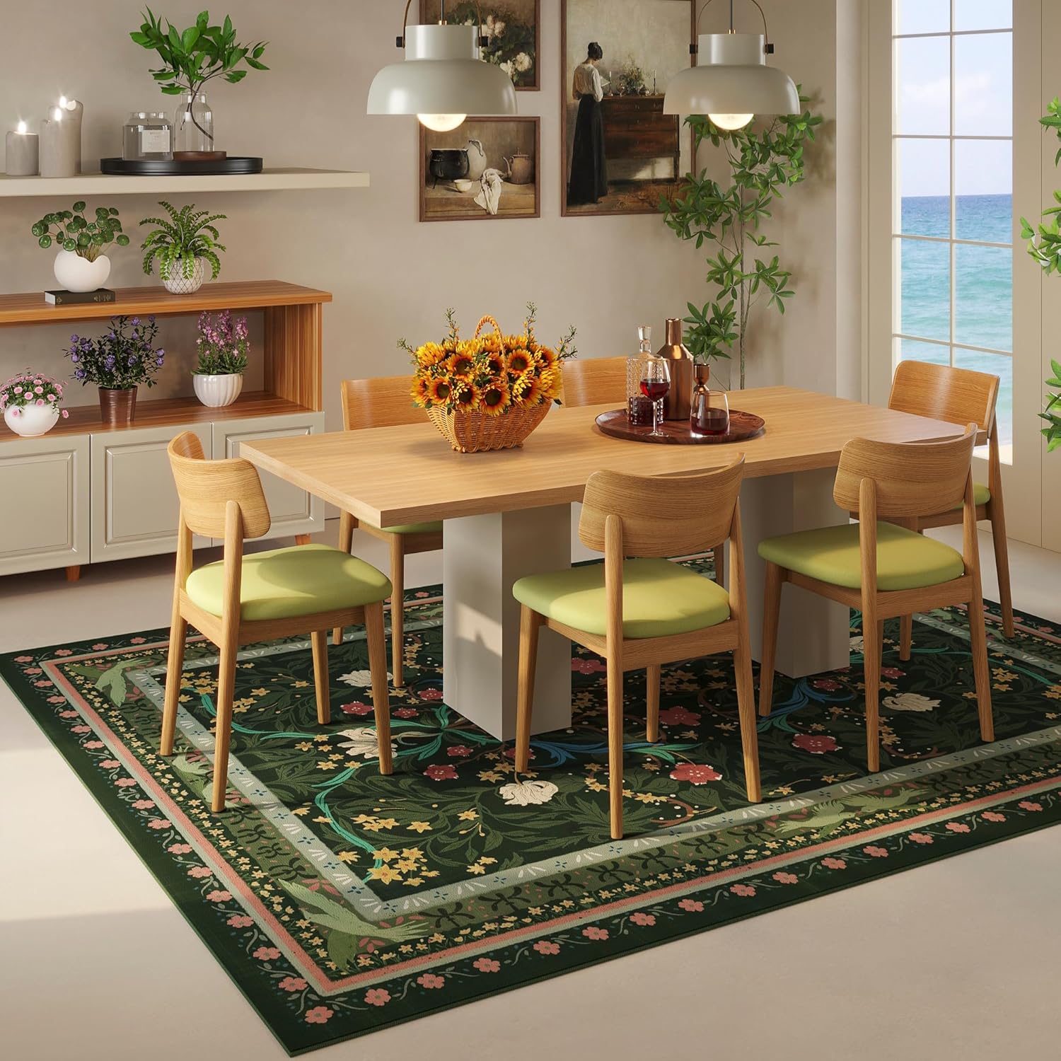 Area Rugs 8x10 for Living Room Clearance Washable Vintage Floral Botanical Rug Non Slip Low Pile Large Rug for Bedroom, Farmhouse, Dining Room, Kids Playroom, Green