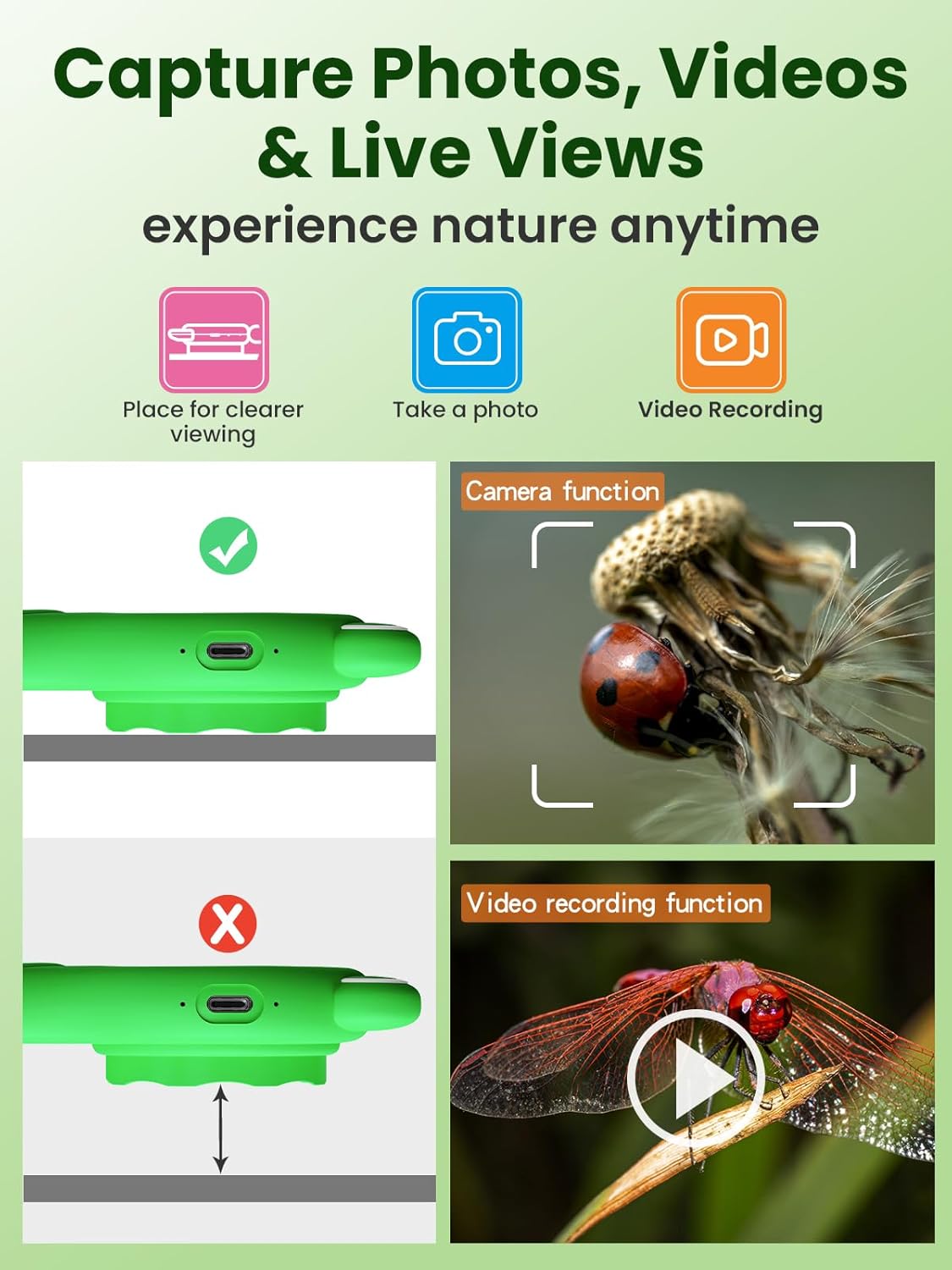 - Supports Three Modes: The device observation mode supports real-time observation and photo-taking functions, and the built-in storage space can store about 200 photos. Memory card recording mode supports photo and video functions (requires insertion of a memory card). Computer Observation Mode: Connect to a computer via Type-C cable to take photos, record videos and store them on the computer (supports Windows 10, 11, Mac OS X/11.0+)