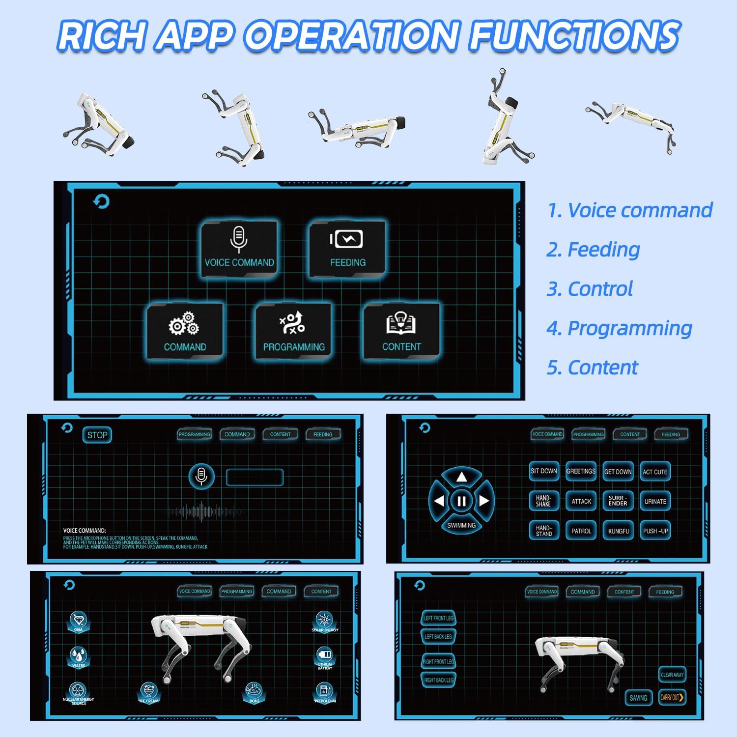 - Interactive Smart Robot Dog - Designed with strong joint and advanced mechanics, this smart AI dog can perform complex actions like kungfu, patrol, act cute, surrender,hand-stand, get down and so on. Besides, it can dance, play music and tell story, a wonderful interactive robot toys