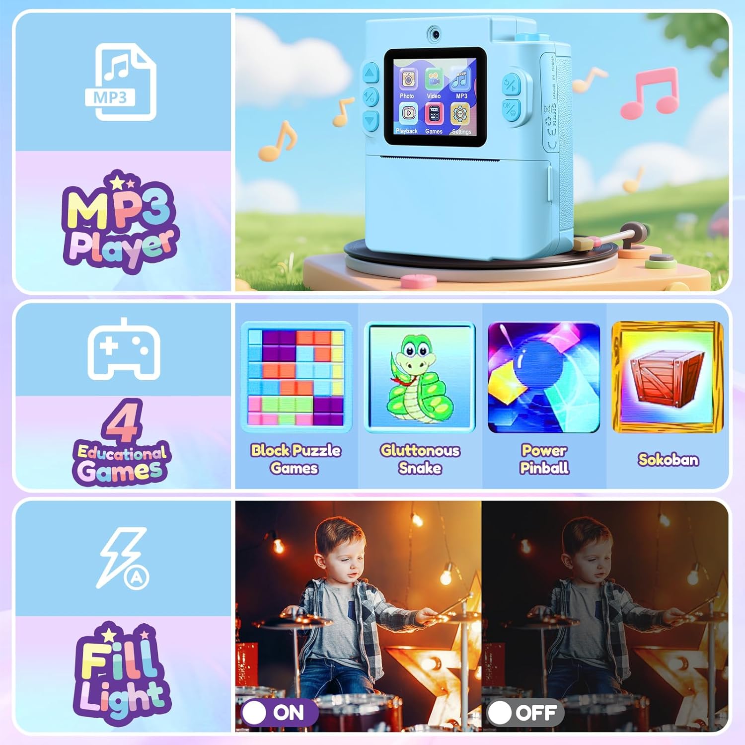 - Camera for Kids with Instant Prints: Using thermal inkless fast print technology, the ink never runs out. This kids camera is a more cost effective solution for kids. And the digital print camera also works with colored thermal papers (Not included, requires separate purchase). Optimal birthday gifts for boys. See the excitement on kid's face when printing what they have captured in 3 seconds!