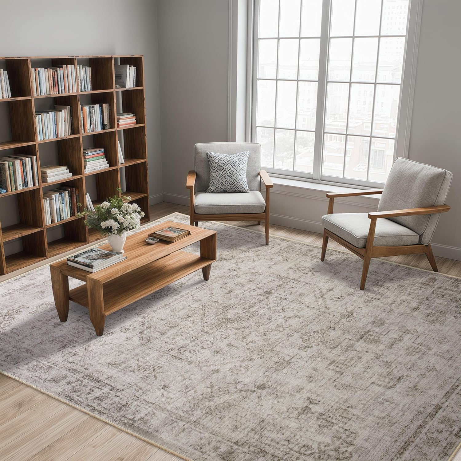 6x9 Washable Area Rug for Living Room, Non-Slip Distressed Rugs for Bedroom Dinning Room, Ultra-Thin Indoor Non-Shedding Vintage Print Carpet for Farmhouse, Home Office, Dorm Light Taupe/Cream