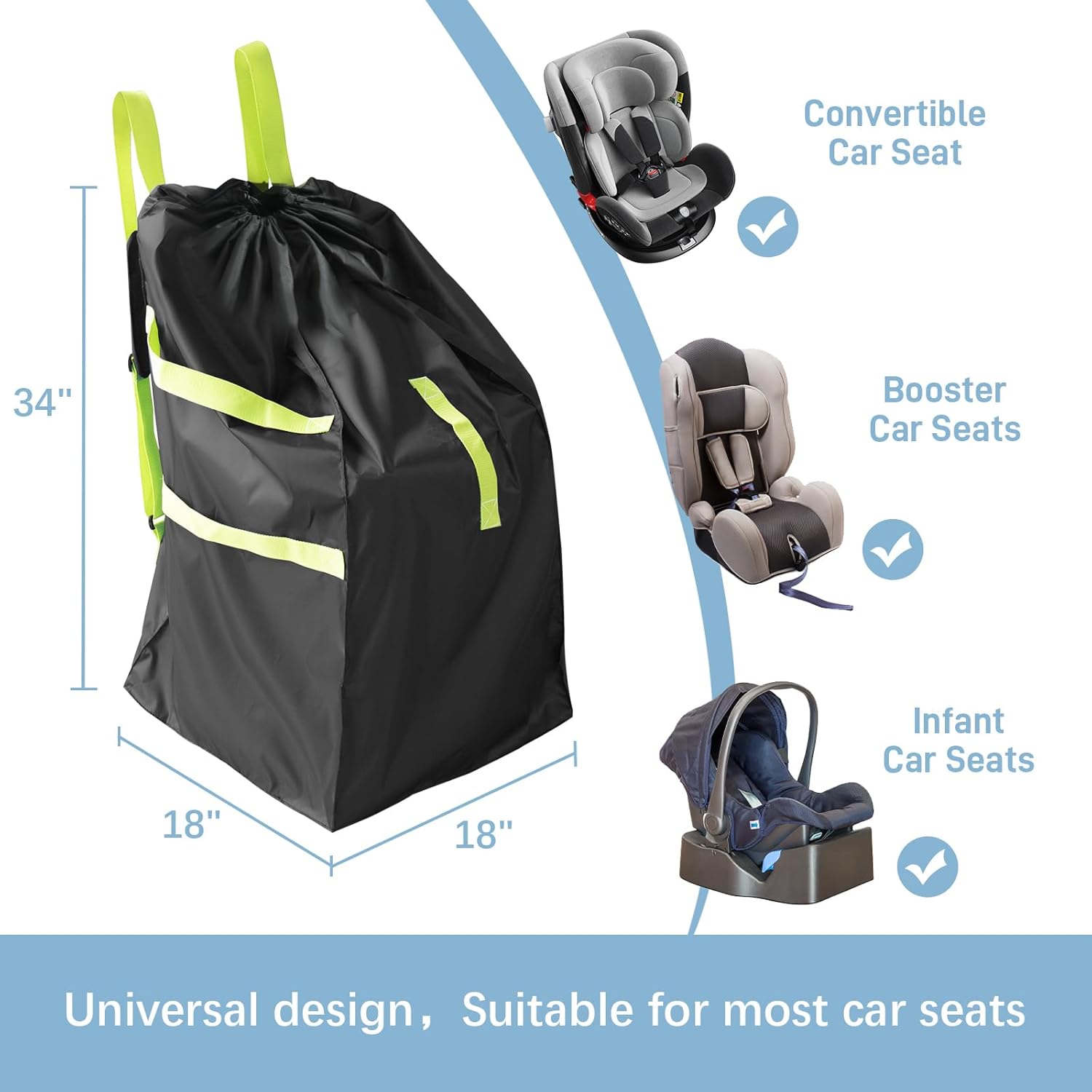 - Large Capacity s & Universal Fit: Measured 34x18x18 inches, the baby car seat travel bag is ideally compatible with almost all major brands of car seats, such as brica, chicco, graco, britax, evenflo, etc. Completely accommodate booster seat, toddler car seat and convertible car seat, meets all your needs.
