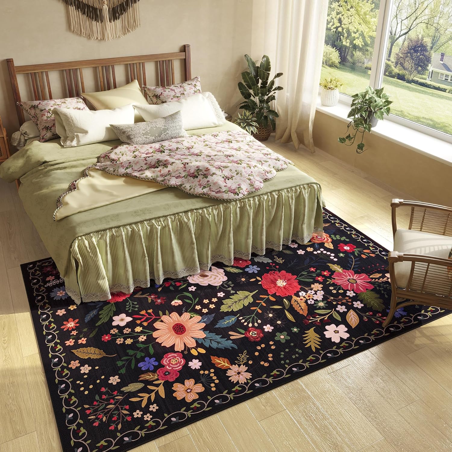 5x7 Washable Rug for Living Room, Floral Black Area Rug, Non Slip Low Pile Soft Flower Carpet, Large Rugs for Bedroom, Dining Room, Office, Kids Playroom, Nursery