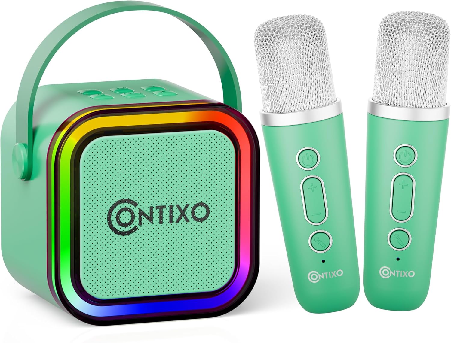 Contixo KS1A Kids Mini Karaoke Machine with LED Lights, 7–10H Playback, Dual Wireless Mics, Magic Voice Effects, Bluetooth Speaker for Children, Portable Singing Toy Gift for Boys & Girls, Green