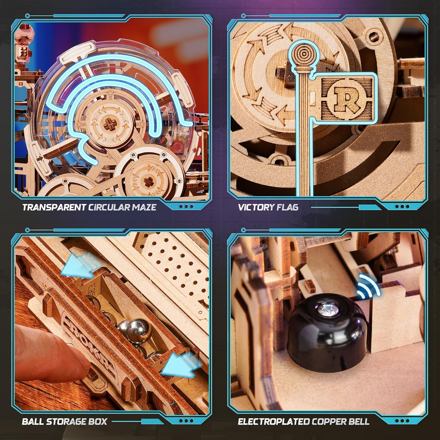- 【ROKR Gear Ball Challenge】Experience thrilling dynamic challenges with ROKR 3d Wooden puzzles Pinball Machine.This interactive puzzle features 6 mechanisms,5-tier tracks, and 4 key controls for precise ball navigation with real-time path adjustments. The transparent circular maze provides full visibility of the ball's movement. Success triggers a bell sound and raises a victory flag.
