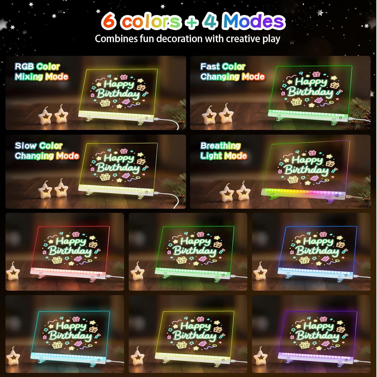 - 【RGB Light Drawing Board】:Civan This multi-color LED board features 6 vibrant RGB colors + 4 dynamic modes (Breath/Fast-flash/Slow-flash/Rainbow Cycle). Bring creations to life with brilliant lights, boosting visual appeal and stimulating your child’s creativity. Instantly transform any space with a single touch – perfect for studying, décor, or celebrations!