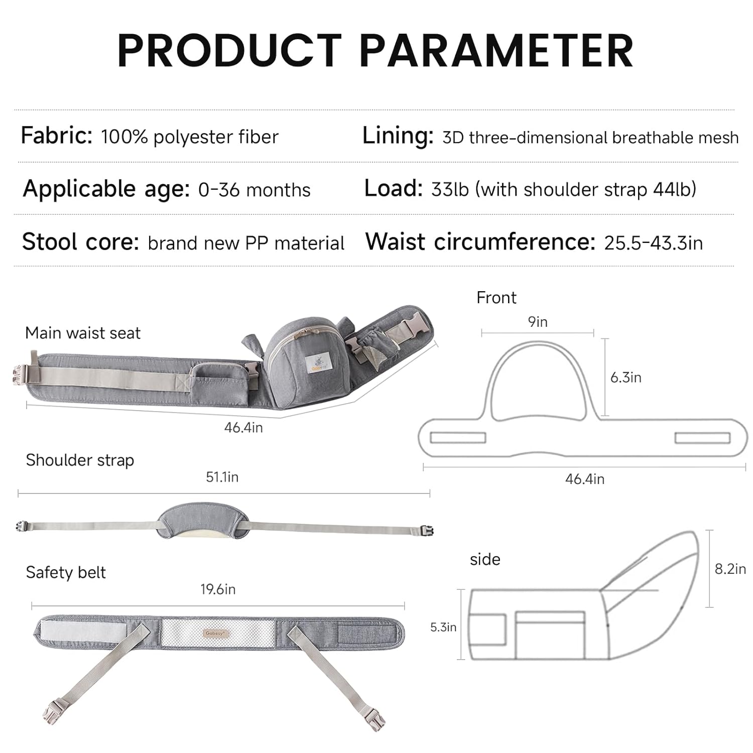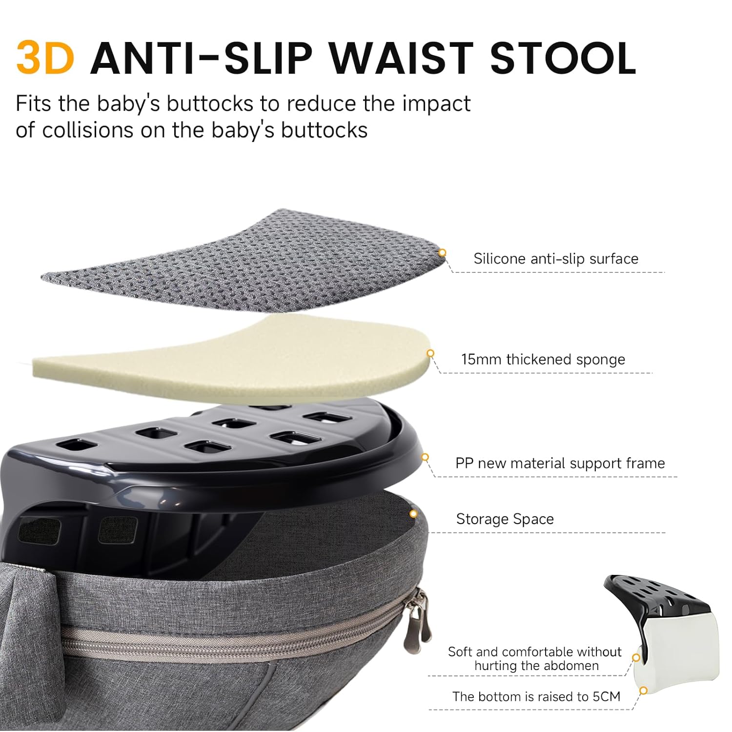 - Full safety details: The baby hip carrier has a mountaineering-grade buckle that is firm and does not slip, an anti-fall safety belt (exclusive for the upgraded version), and a night reflective strip to protect every moment of travel; anti-slip and shock-absorbing stool surface, 15MM sponge + silicone particles, the baby sits steadily and comfortably.
