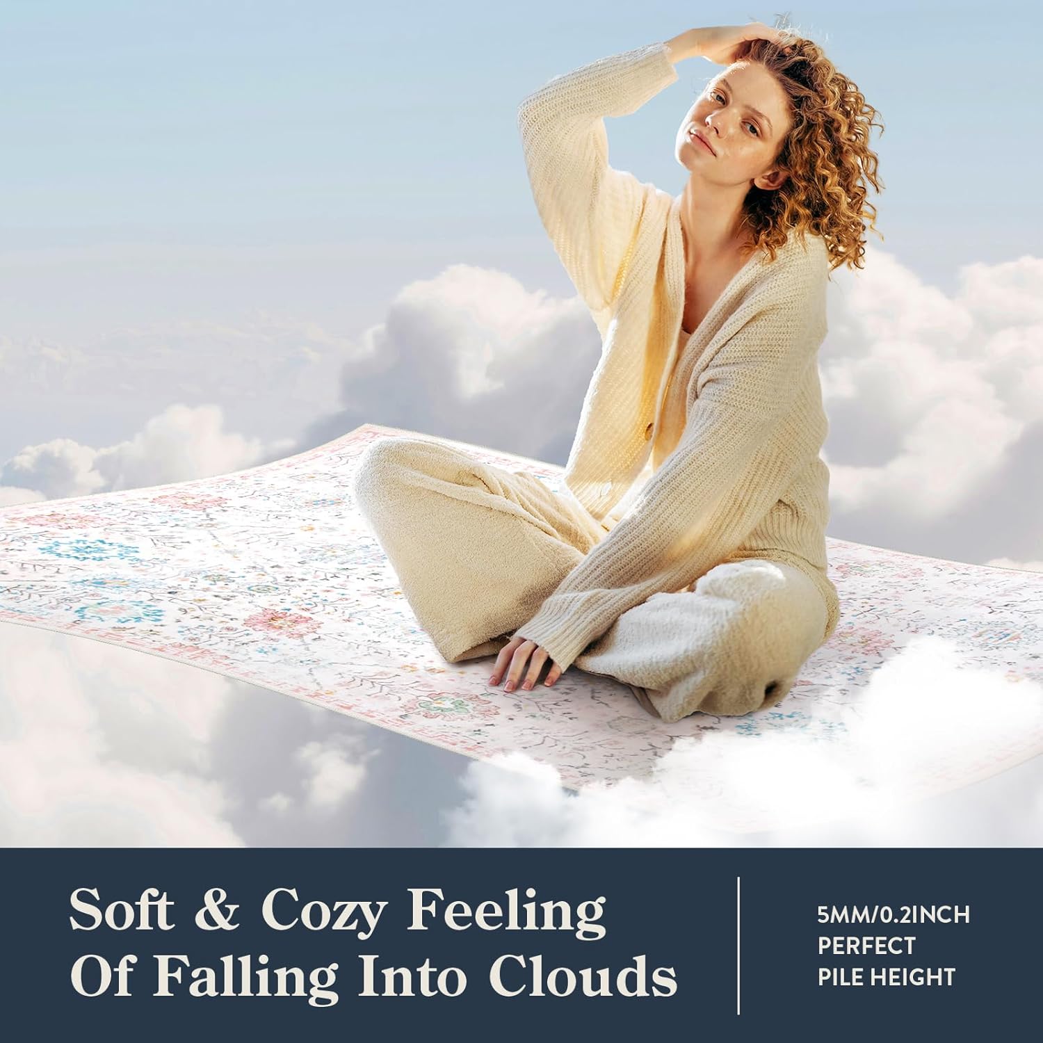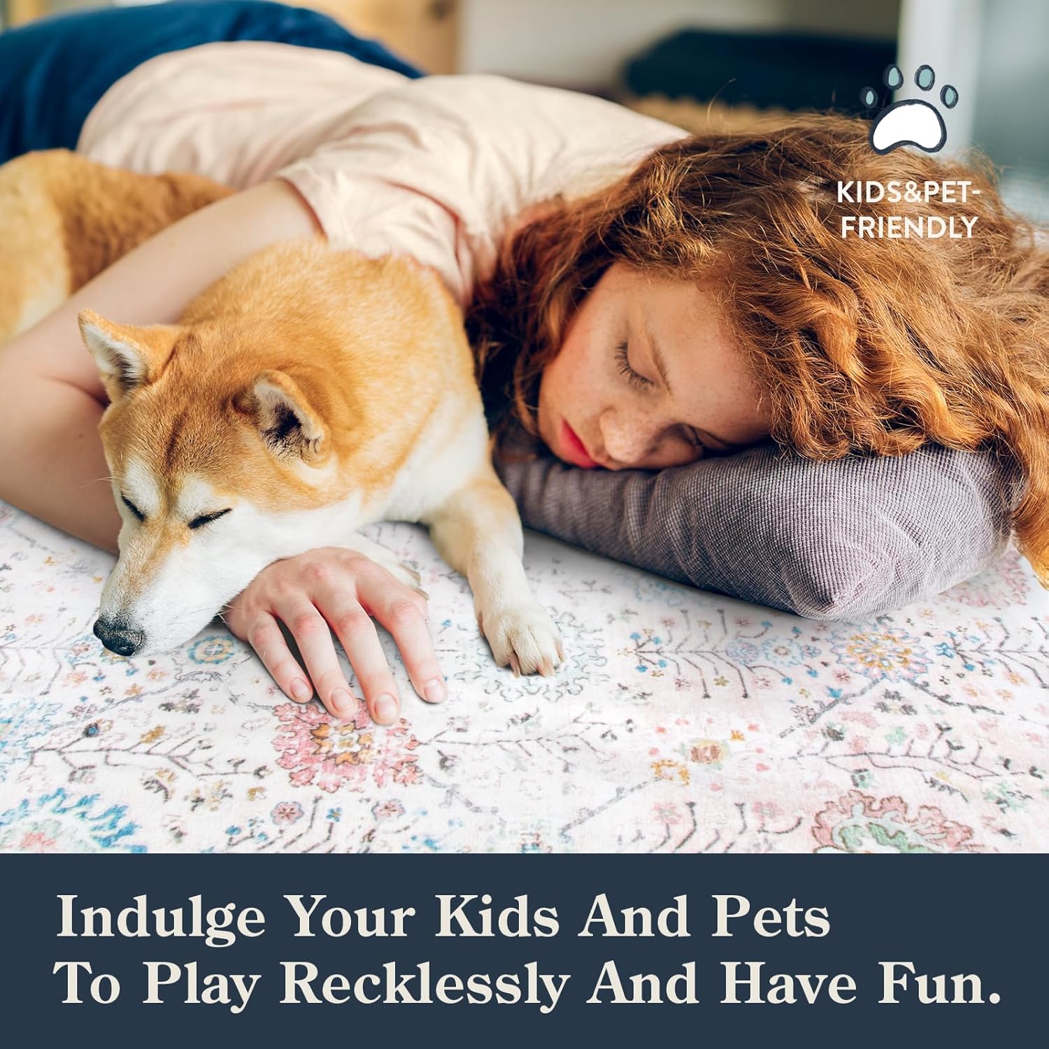 Lahome Soft Nursery Rug, Washable Area Rugs 5x7 for Cozy Kids Room, Lightweight Boho Carpet for Dorm with Non Slip Backing, Non Shedding Easy Care Floral Simple Carpets for Bedroom Living Room, Beige