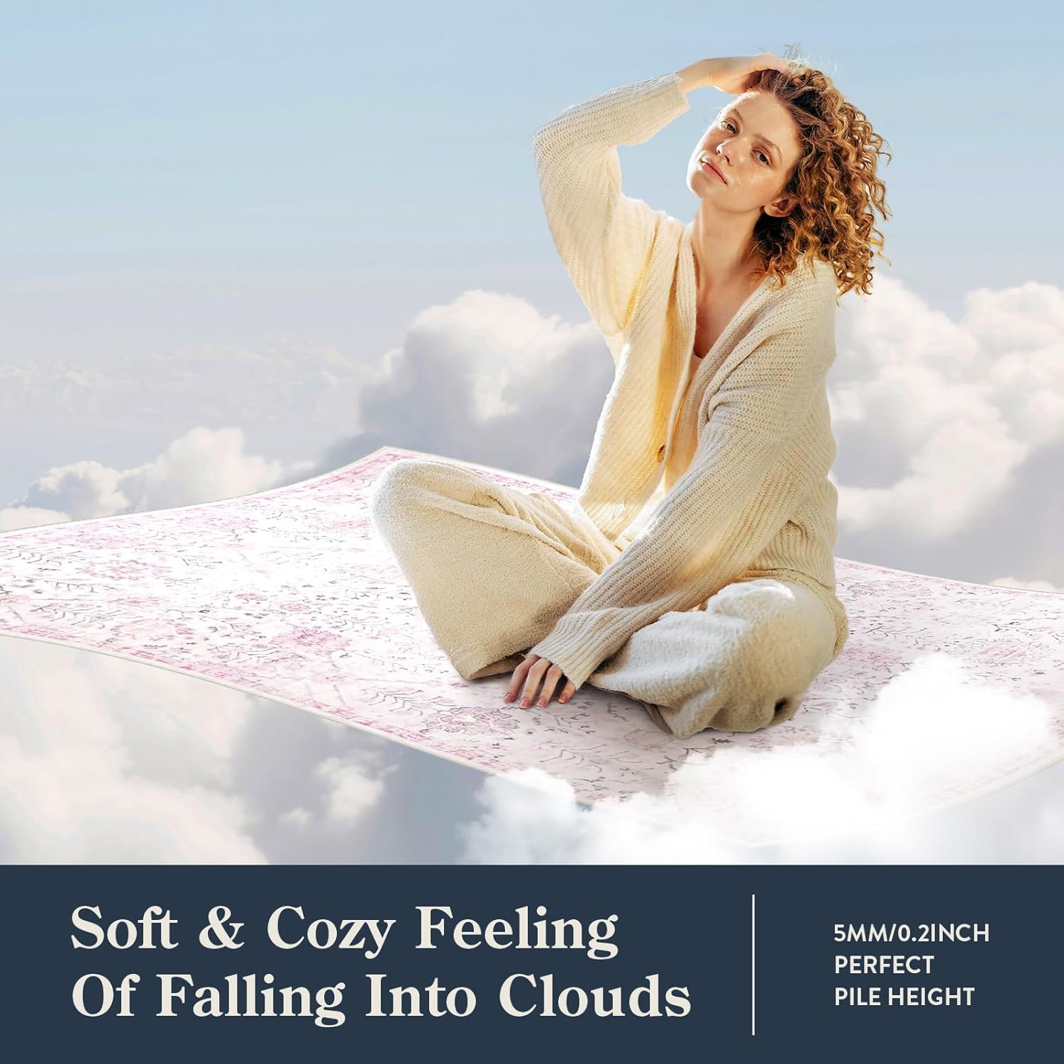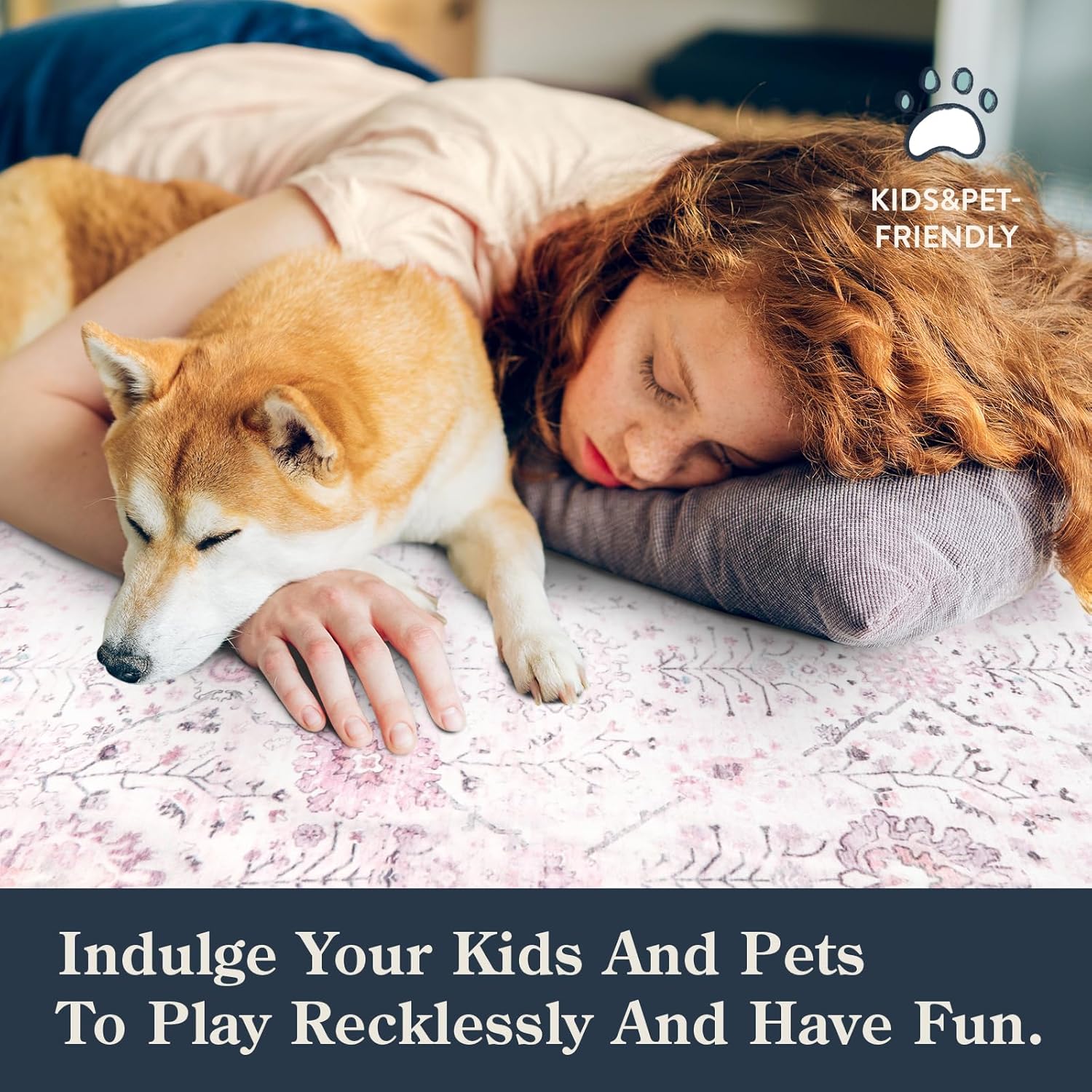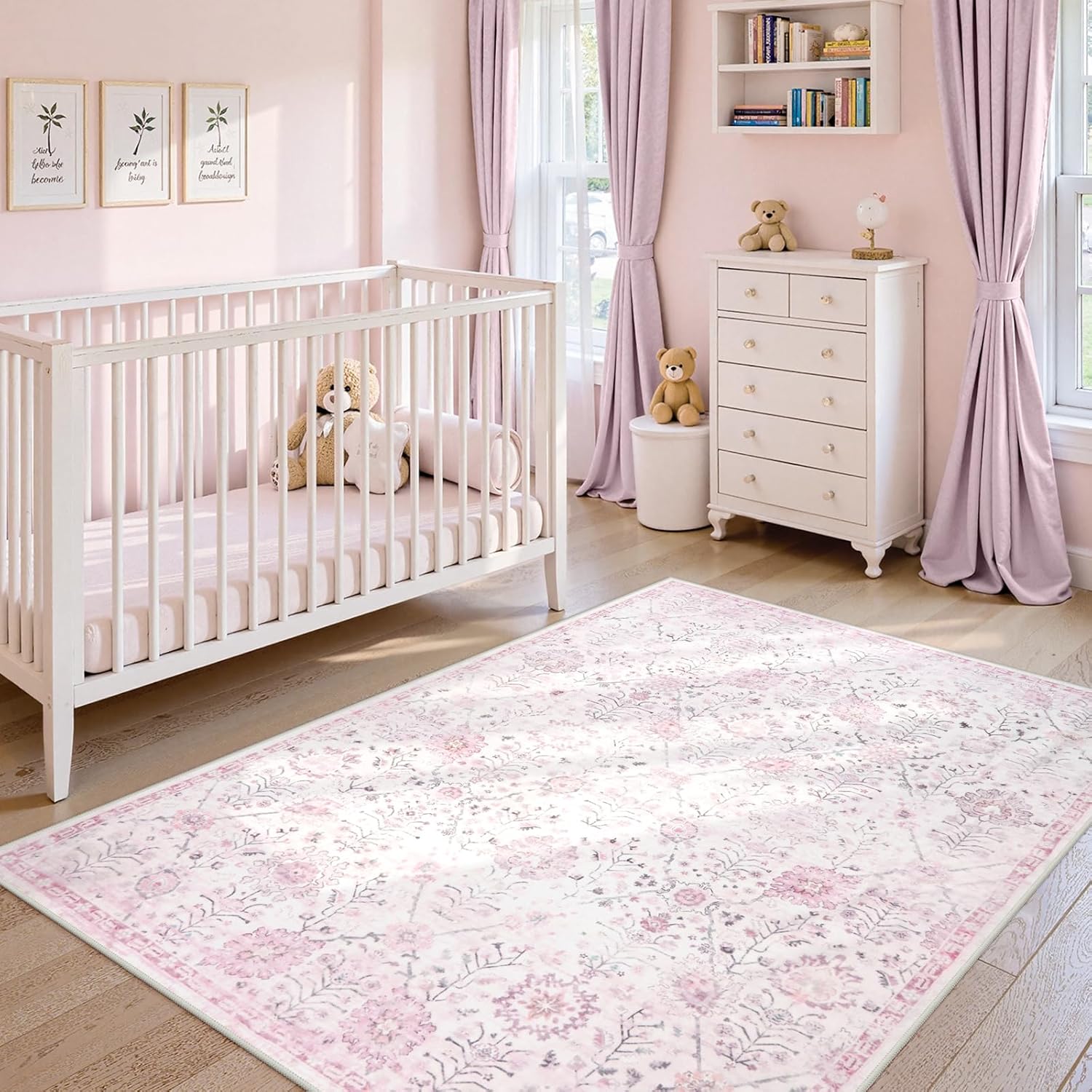Lahome Nursery Rug 5x7, Soft Kids Rugs for Cozy Bedroom, Washable Boho Purple Carpet for Toddlers Girls Room, Non Shedding Non Slip Pastel Floral Print Thin Simple Carpets