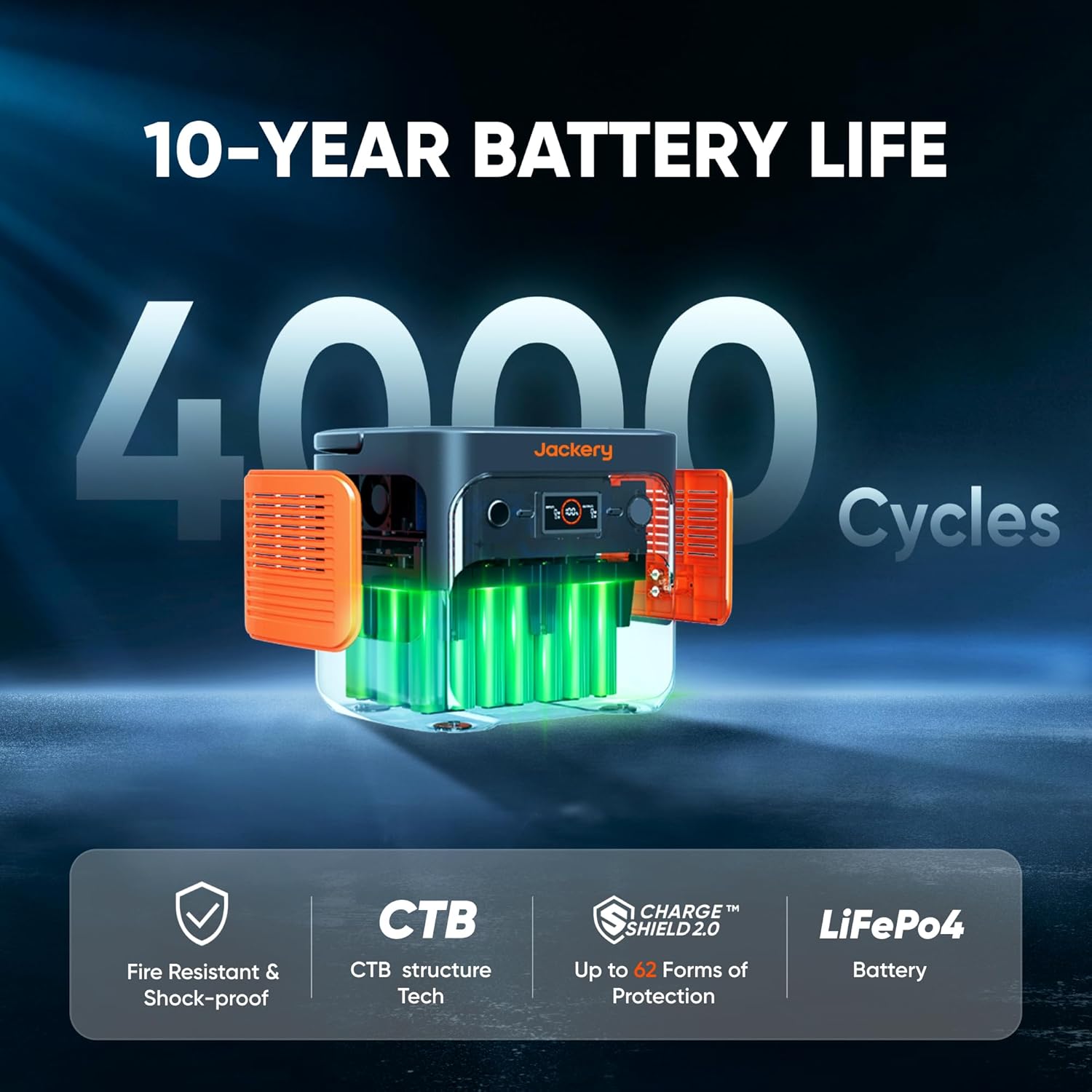 - Durable for 10 Years: The Jackery Explorer 2000 v2 Solar Generator comes with a LiFePo4 battery that lasts up to 10 years, making this safe, compact power station a dependable long-term investment. Use it outdoors and indoors, risking no fumes and enjoying a safe, eco-friendly alternative to gas generators.