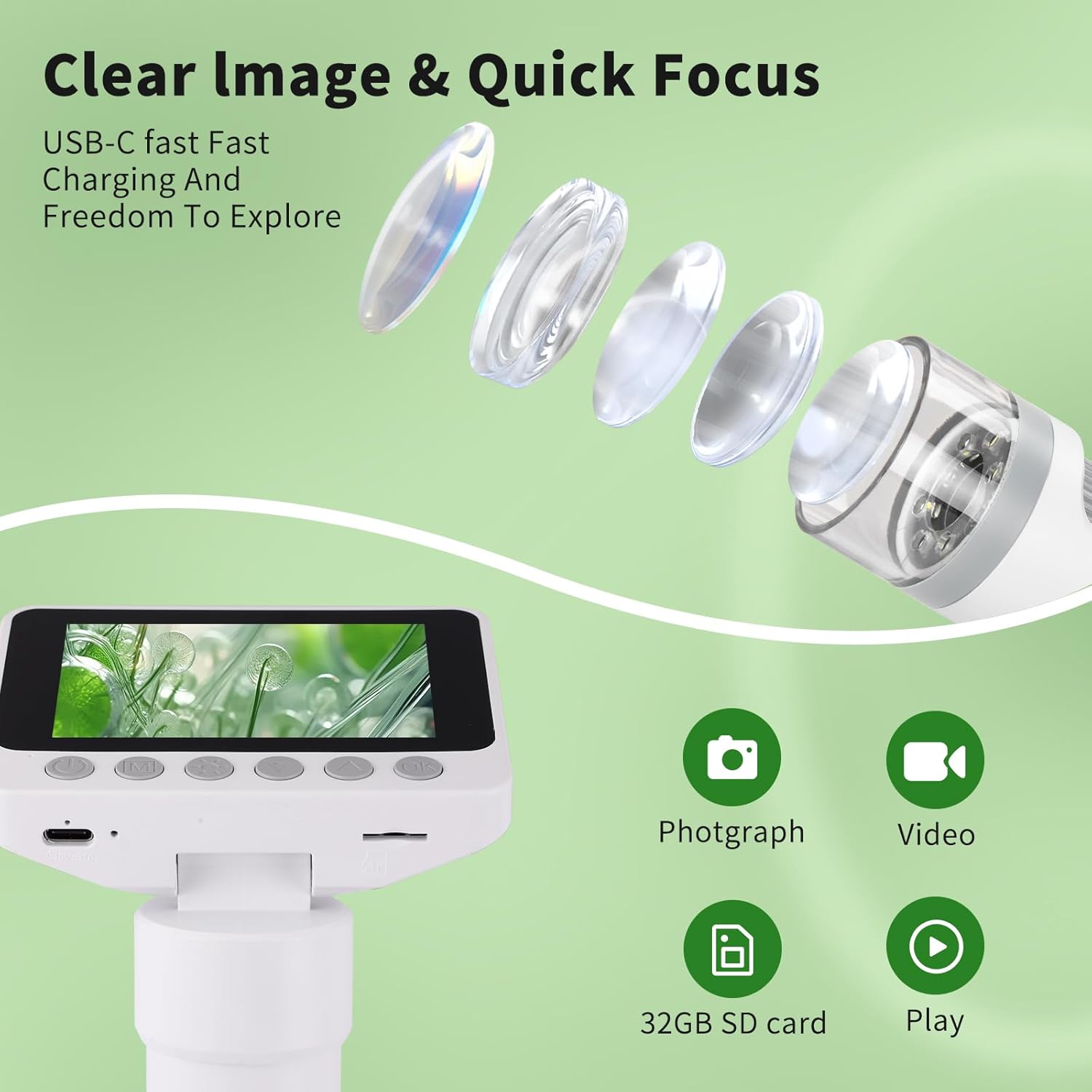 - Multi-functional expansion: A multi-functional device, not just a kids microscope, but also cameras, video recorders, binoculars, magnifying glasses, support for USB portable charging, battery life of 2-3 hours