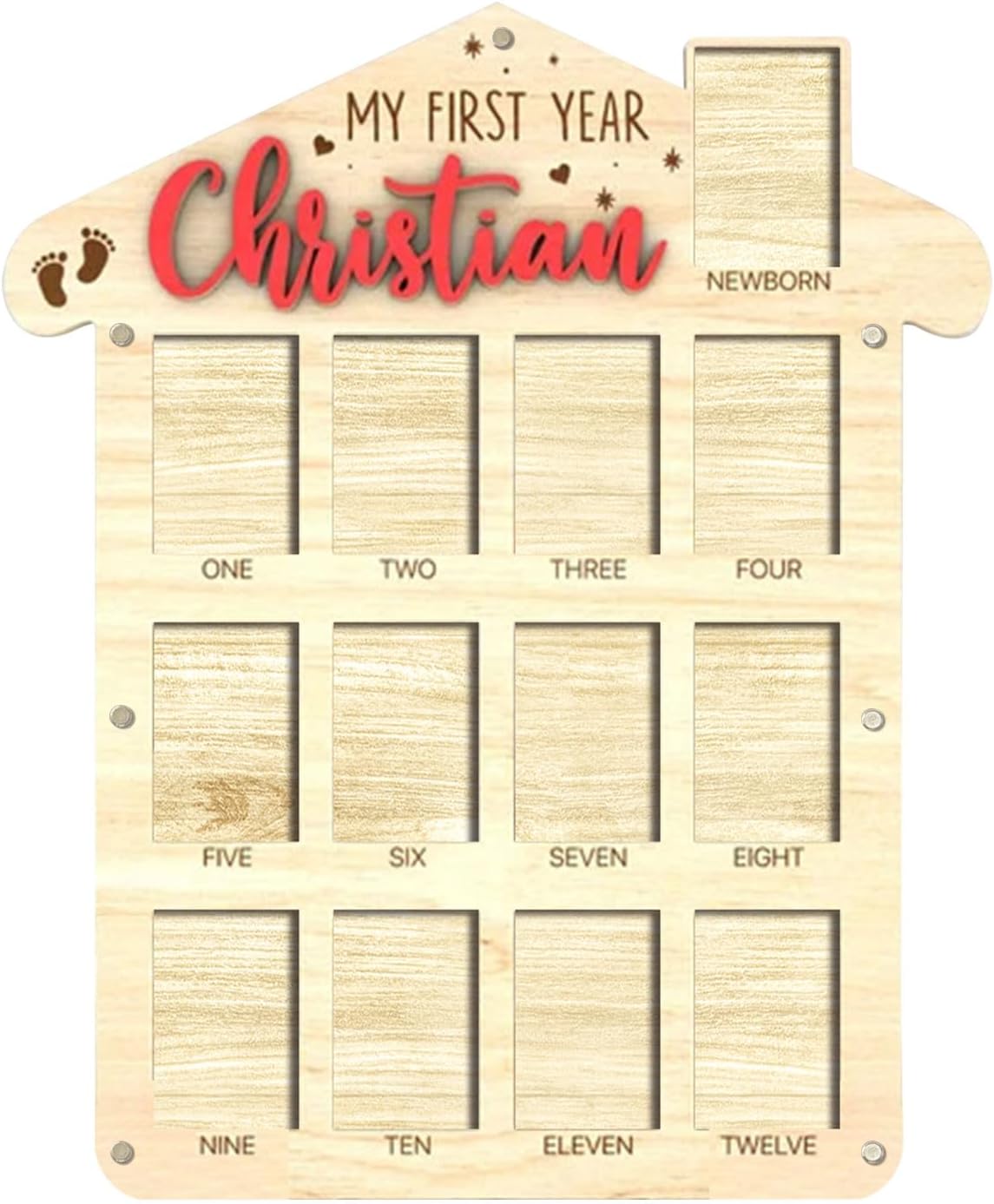 - My First Year Photo Frame: Capture your baby’s first year with our babys first year picture frame. This baby first year photo frame helps you record their growth from newborn to one year, showcasing each milestone in a 12 month picture frame for baby first year. The wooden plaque includes space for your baby’s full name, making it a personalized keepsake. Our 12 month pictures for baby first year, my first year photo board, one year photo board is a wonderful way to celebrate these moments.