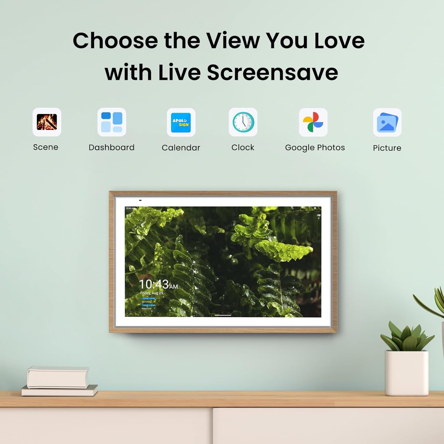 - Smart Photo Frame, Without Subscription — 21.5" HD touchscreen with anti-glare, adaptive auto-brightness, and eco-friendly sleep mode. Certified Amazon Climate Pledge Friendly, crafted with sustainable materials. Wooden frame for wall mounting, transforms into a smart photo frame or live screensaver—sync with Google Photos or upload directly, no subscription required.
