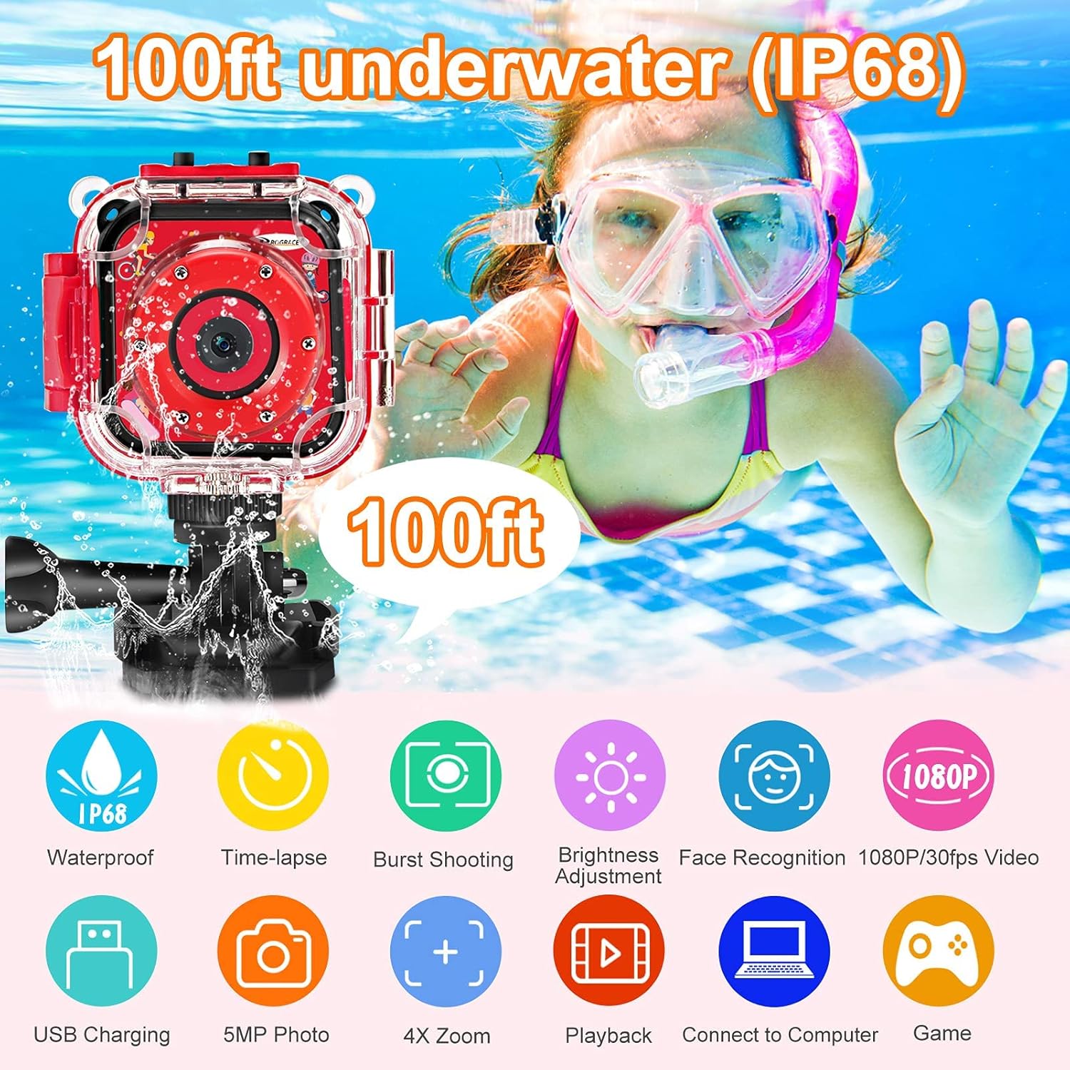 PROGRACE Waterproof Camera for Kids - Christmas Birthday Gifts for 3-12 Year Old Girls 1080P Toddler Digital Cameras Pool Toys for Kids Underwater Video Camera with 32GB SD Card Red