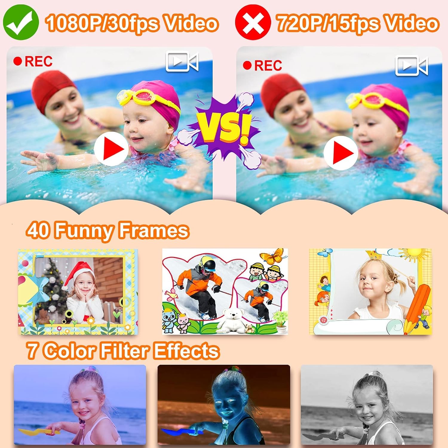 - HD Multifunctional Kids Video Camera: Capture clear memories with HD 1080P video and 5MP photo capability. This camera for kids 3-8 includes 40 fun frames, 7 color filters, 4X digital zoom, burst shooting, and time-lapse features for creative expression
