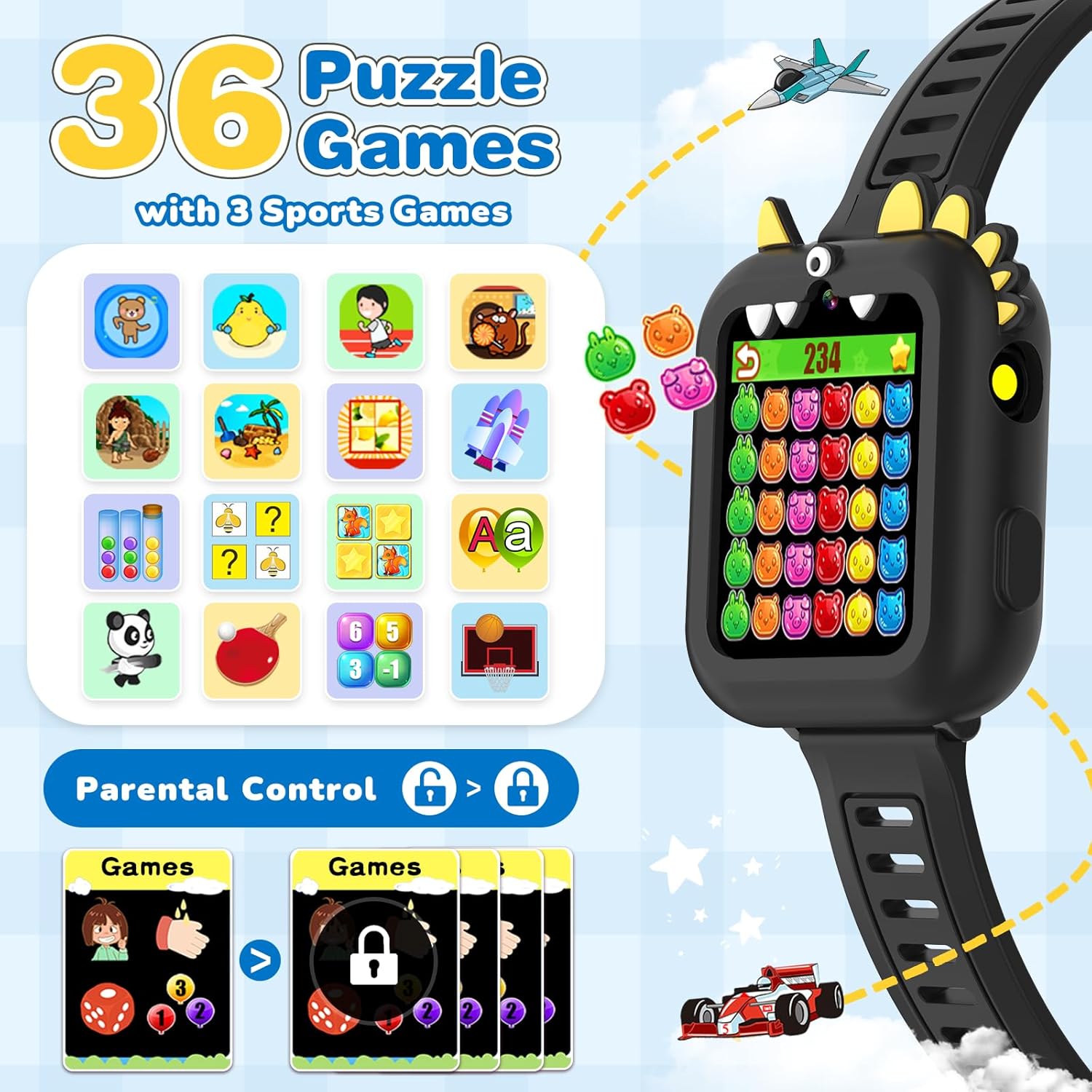 - Fun and Relaxation Time: Upgraded kids watch has 36 puzzle games and 3 sports games, which can help children relax and release stress, effectively exercising their logical thinking, reaction skills, and hand-eye coordination. Kids watch built-in 10 audio stories, high-quality MP3 music player, allowing children to enjoy music anytime and anywhere. It is ideal toys for boys 8-10
