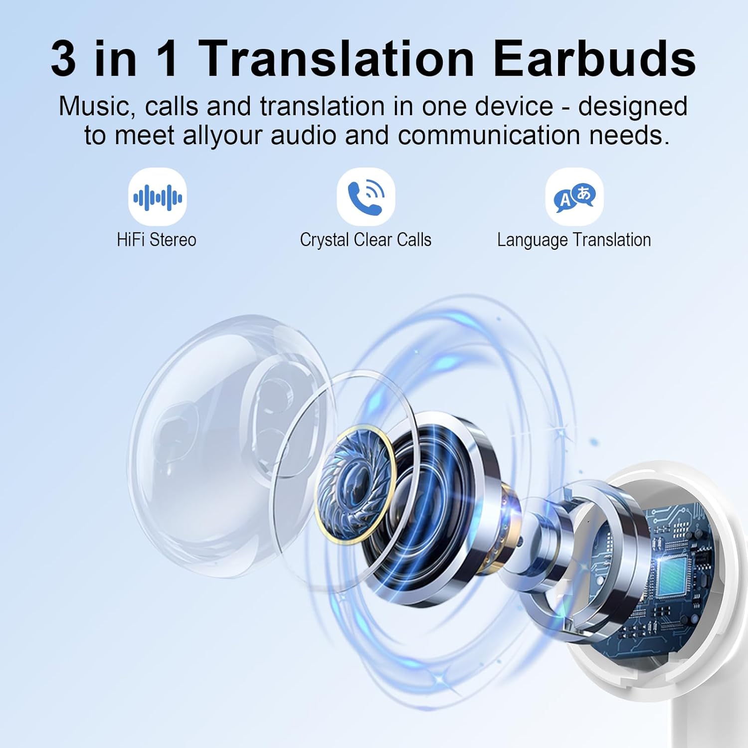 - 3-in-1 Languages Real-Time Translation Earbuds: Experience the newly upgraded translation earbuds, which integrate offline translation, HD calls, and immersive music playback functions, providing versatility and convenience for work and daily life. J51 Translator earbuds equipped with the latest Bluetooth 5.3 technology, the translators Headphones real time ensure rapid and stable connections for seamless transitions between tasks, letting you enjoy uninterrupted multilingual conversations.