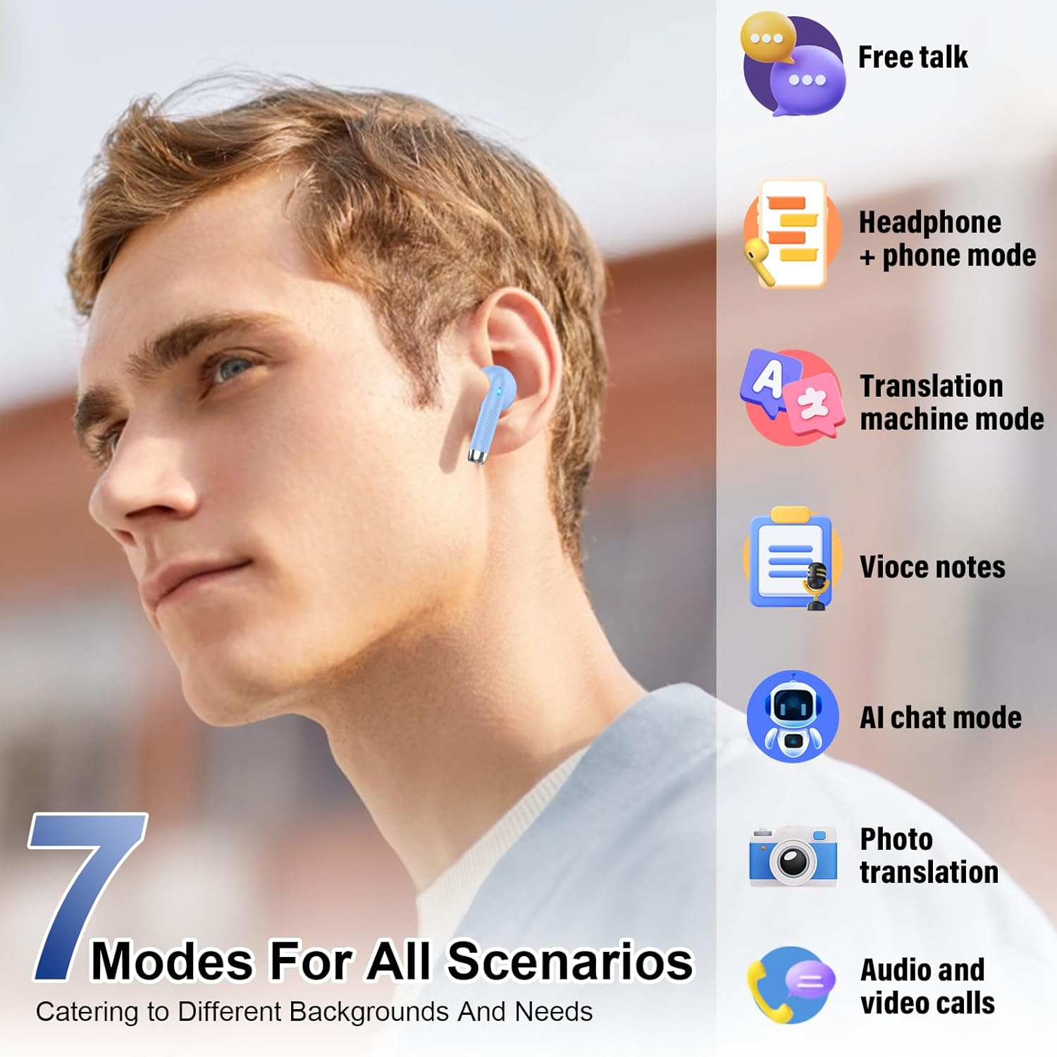 - Choose from 6 powerful translation modes to meet all your needs: Our translation headphones feature free talk mode auto‑detects and the translator earbuds translates speech in real time; Headset + Phone mode lets one user wear the earbud while the other taps their phone achieve quick two - way interaction; Translation Mode plays works the same as a traditional translator, translations through your speaker; Camera Mode translates captured text; Voice Memo mode converts speech to text; and Audio & Video Mode enables seamless live translation of both audio and video.