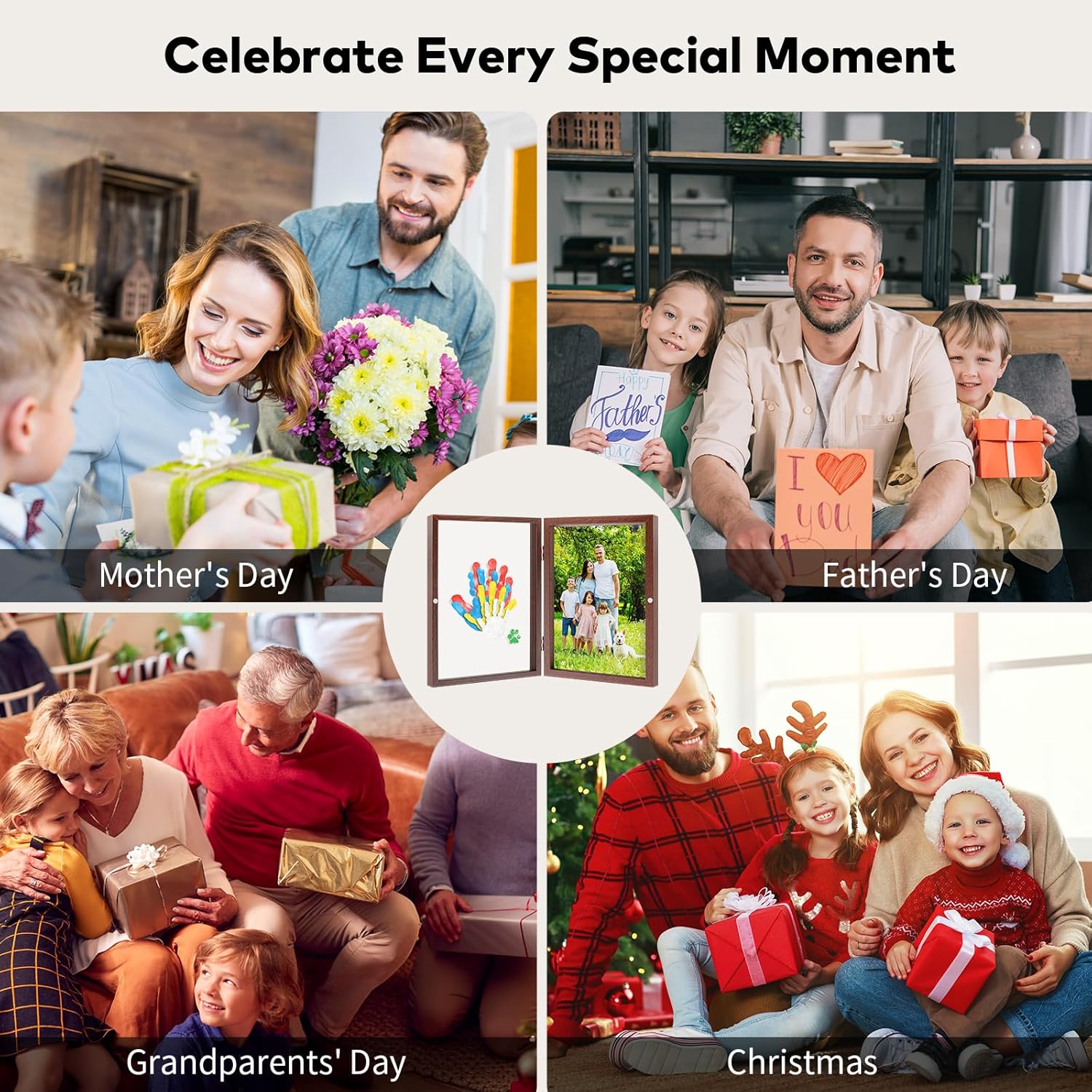 - DUAL DISPLAY MODES & PHOTO AREA: Our upgraded keepsake frame also have a photo frame feature, the photo side is big enough to hold one large photo or several smaller ones. Imagine this framed treasure on your living room wall: your toddler's tiny hand nestled in yours, surrounded by family photos that spark conversations for generations