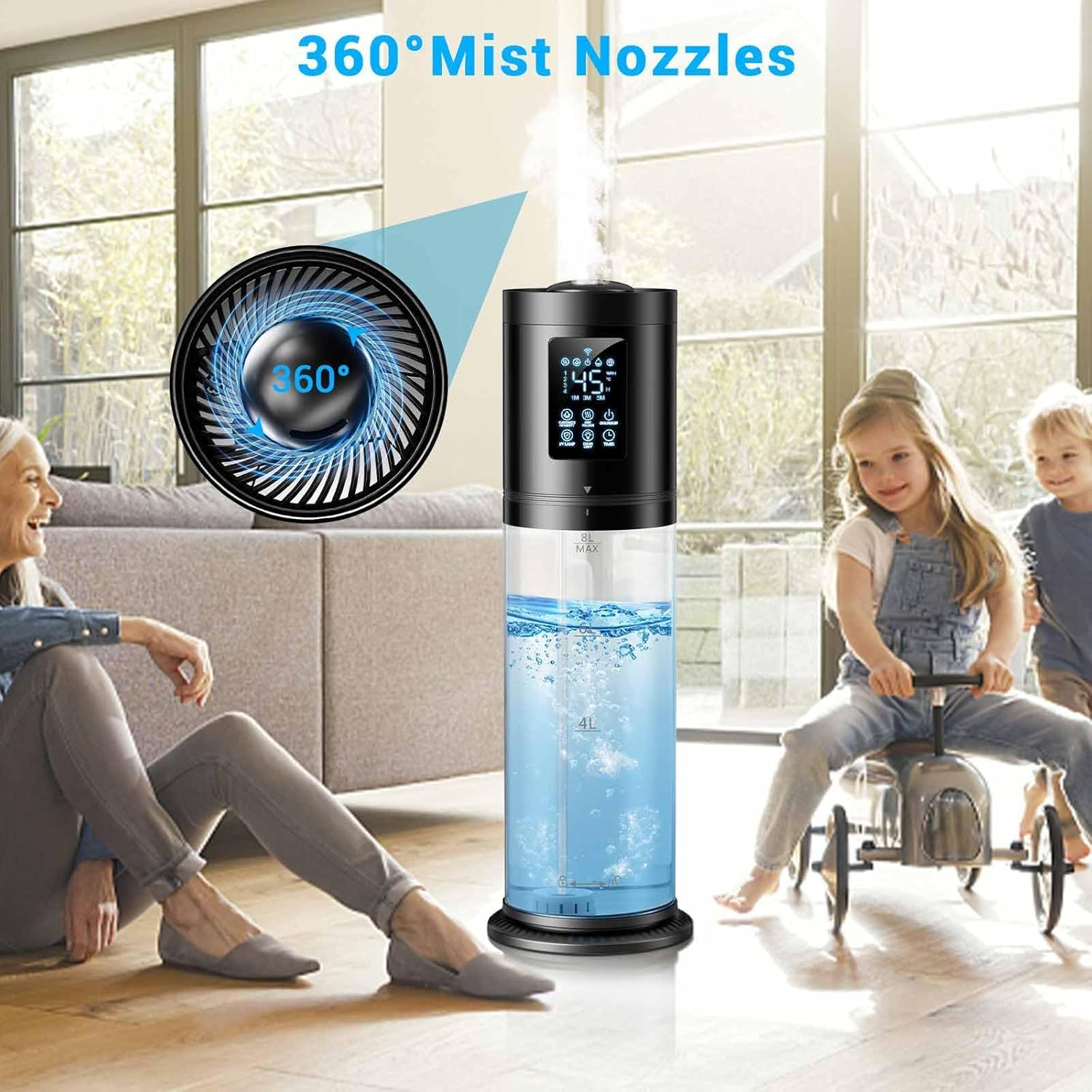 - 【2.1 Gallon Capacity & Powerful Cool Mist】 This high-performance cool mist humidifier delivers long-lasting moisture for large rooms, featuring a 2.1 gallon water tank and a powerful ultrasonic mist system. With 4 mist levels and a 360° adjustable nozzle, it ensures even humidity distribution throughout your space while operating quietly for a peaceful environment