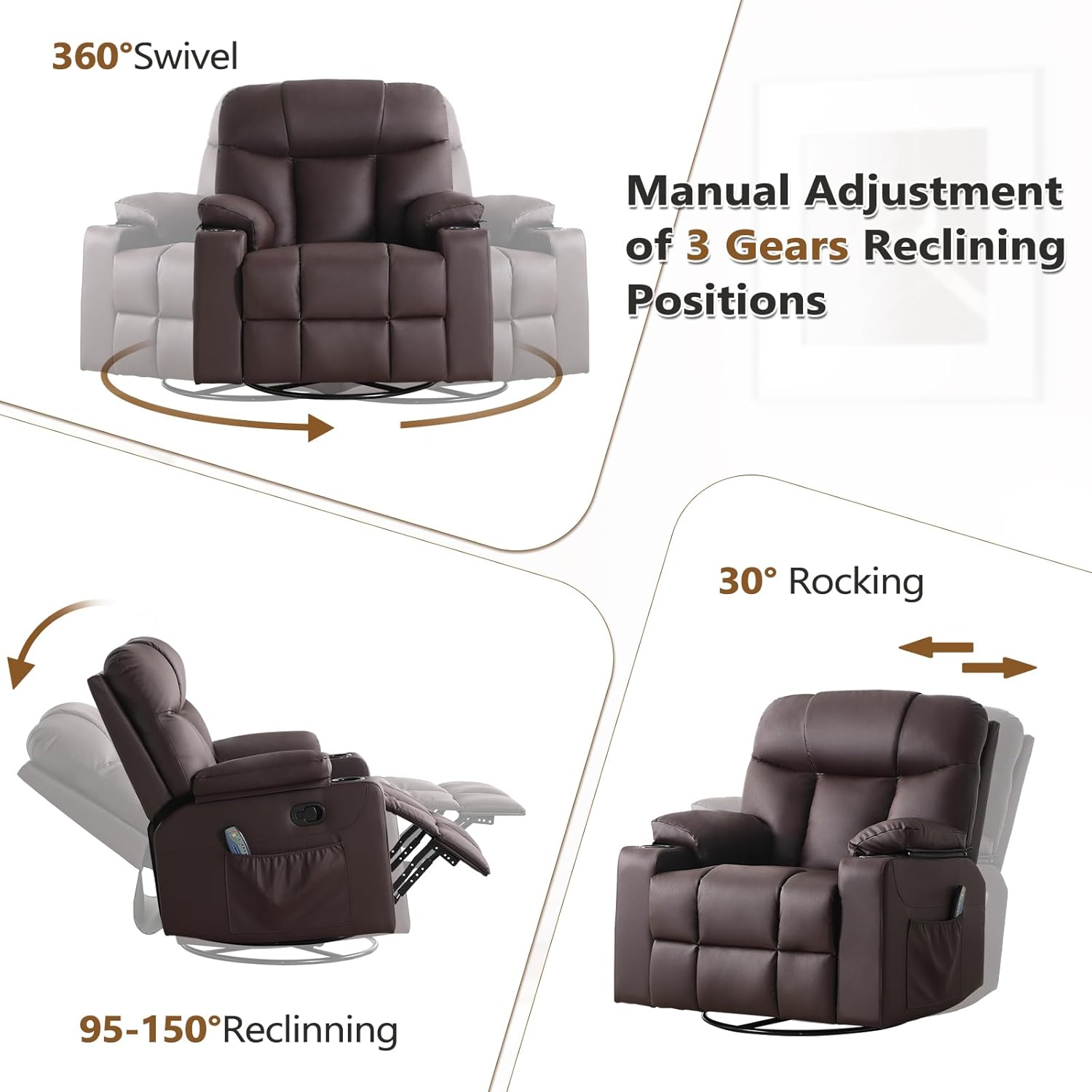 ANJ Swivel Rocker Recliner Chair Set of 3, Brown PU Leather, Manual 3-Position Reclining with Massage & Heat, Cup Holders for Living Room