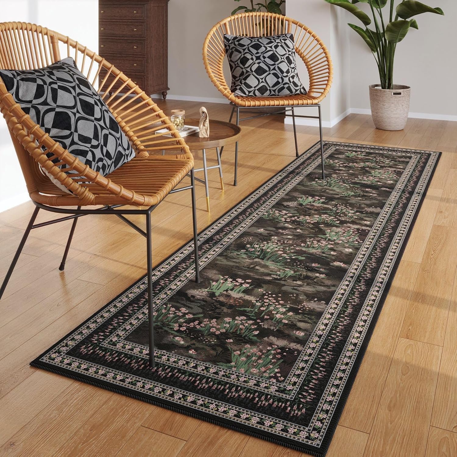Runner Rug Impressionist-Style Vintage Kitchen Rugs Non Slip Washable Soft Carpet Runner for Kitchen Laundry Bedroom Bathroom, Black