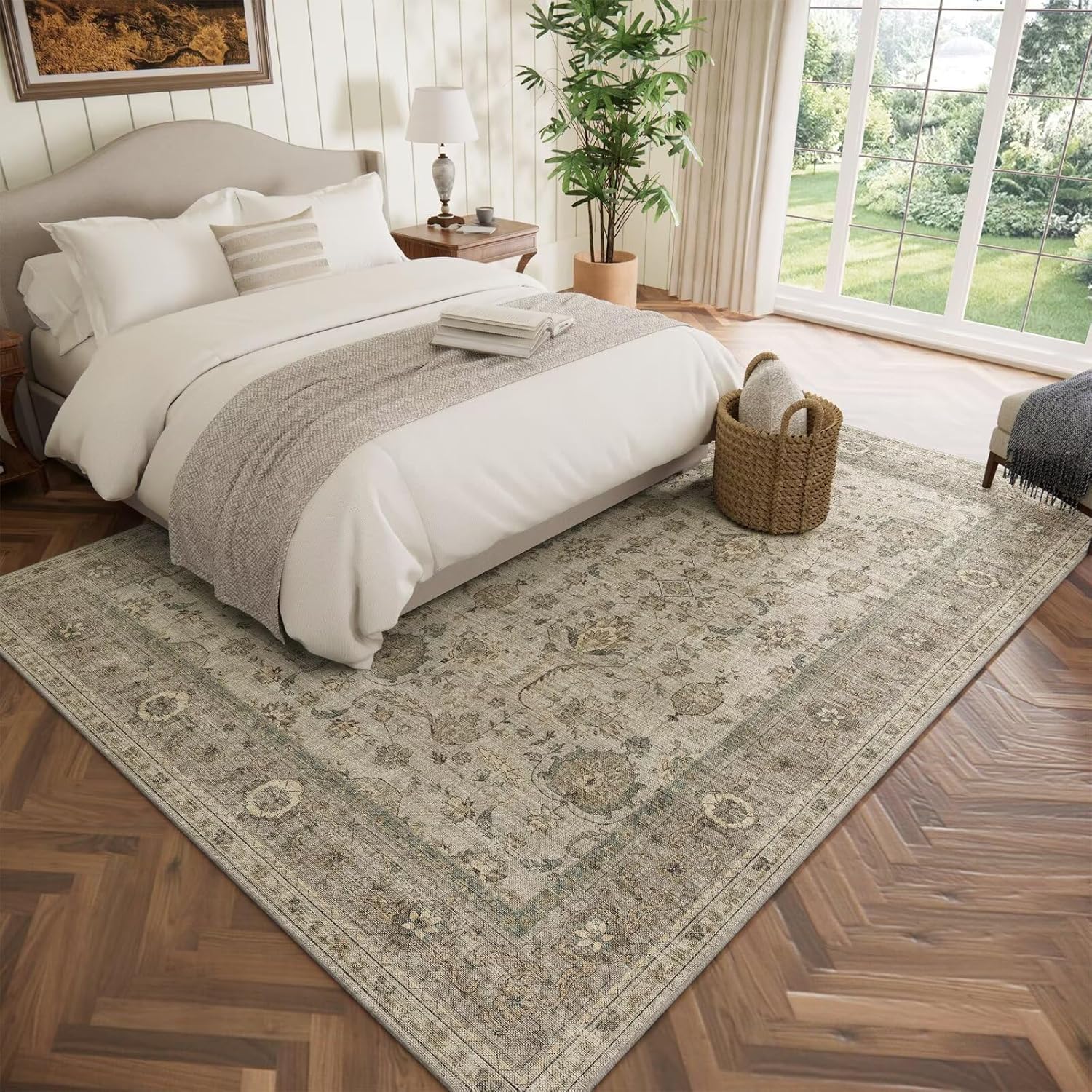 Washable 5x7 Area Rugs for Living Room, Boho Non-Slip Silicone Backing Rugs for Bedroom Dining Room Nursery Office, 0.3" Neutral Oriental Throw Carpet with 0.16" Cushioning Pad, Light Brown/Multi