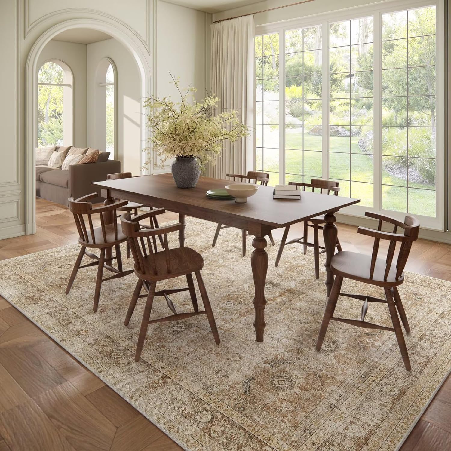 Washable 8x10 Area Rugs for Living Room, Boho Non-Slip Silicone Backing Rugs for Bedroom Dining Room Nursery Office, 0.3" Neutral Oriental Throw Carpet with 0.16" Cushioning Pad, Brown/Multi