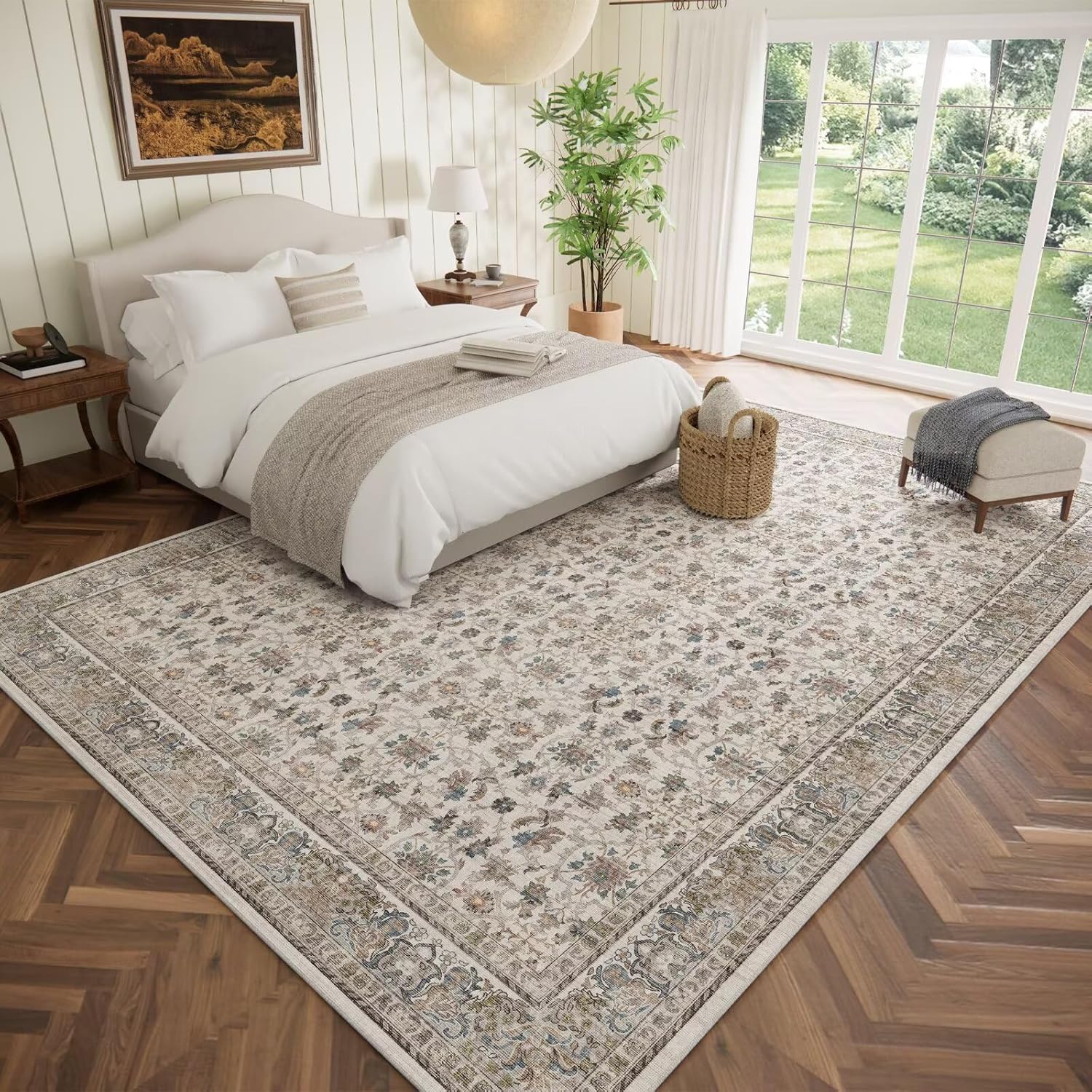 Washable 9x12 Area Rugs for Living Room, Boho Non-Slip Silicone Backing Rugs for Bedroom Dining Room Nursery Office, 0.3" Neutral Oriental Throw Carpet with 0.16" Cushioning Pad, Cream/Multi