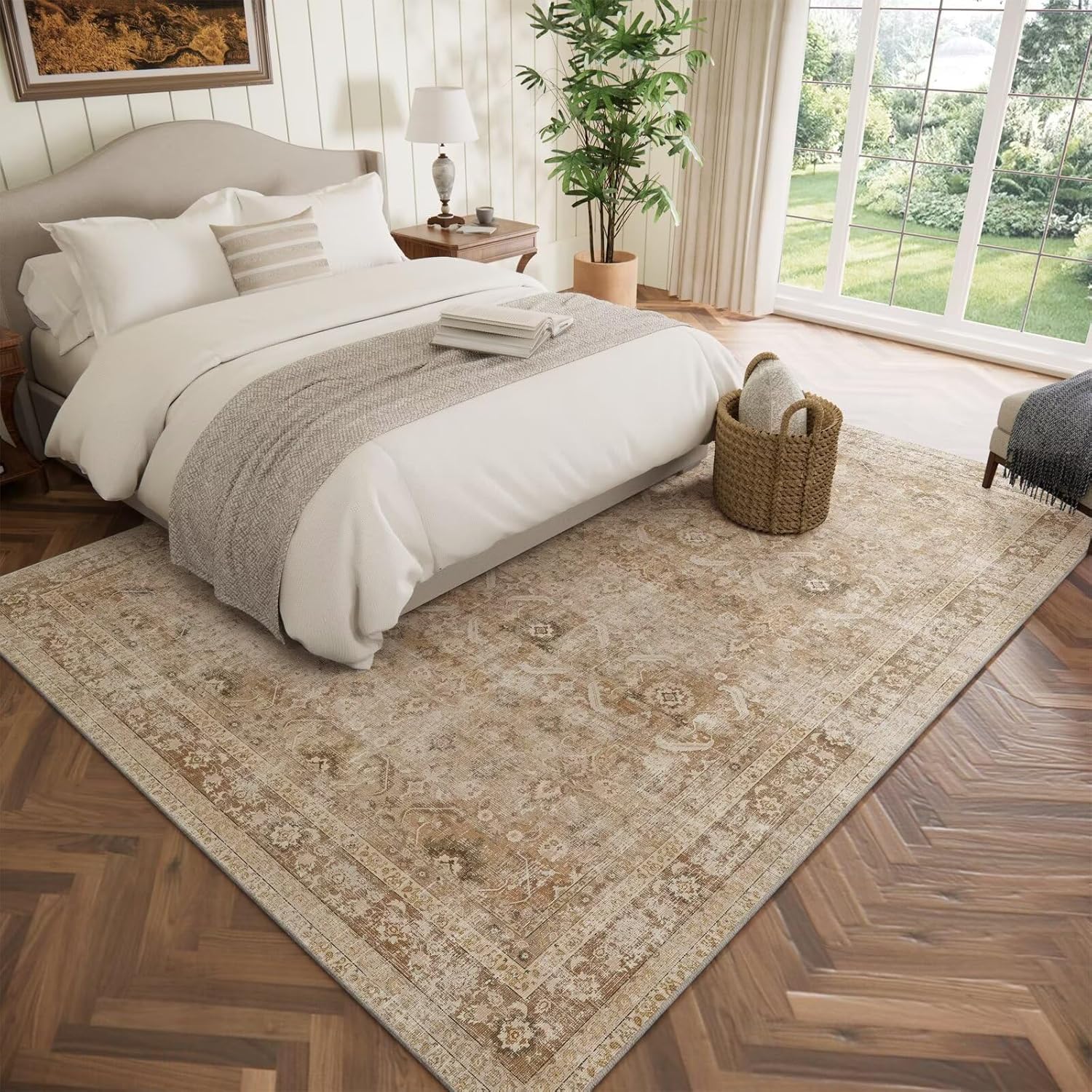 Washable 5x7 Area Rugs for Living Room, Boho Non-Slip Silicone Backing Rugs for Bedroom Dining Room Nursery Office, 0.3" Neutral Oriental Throw Carpet with 0.16" Cushioning Pad, Brown/Multi