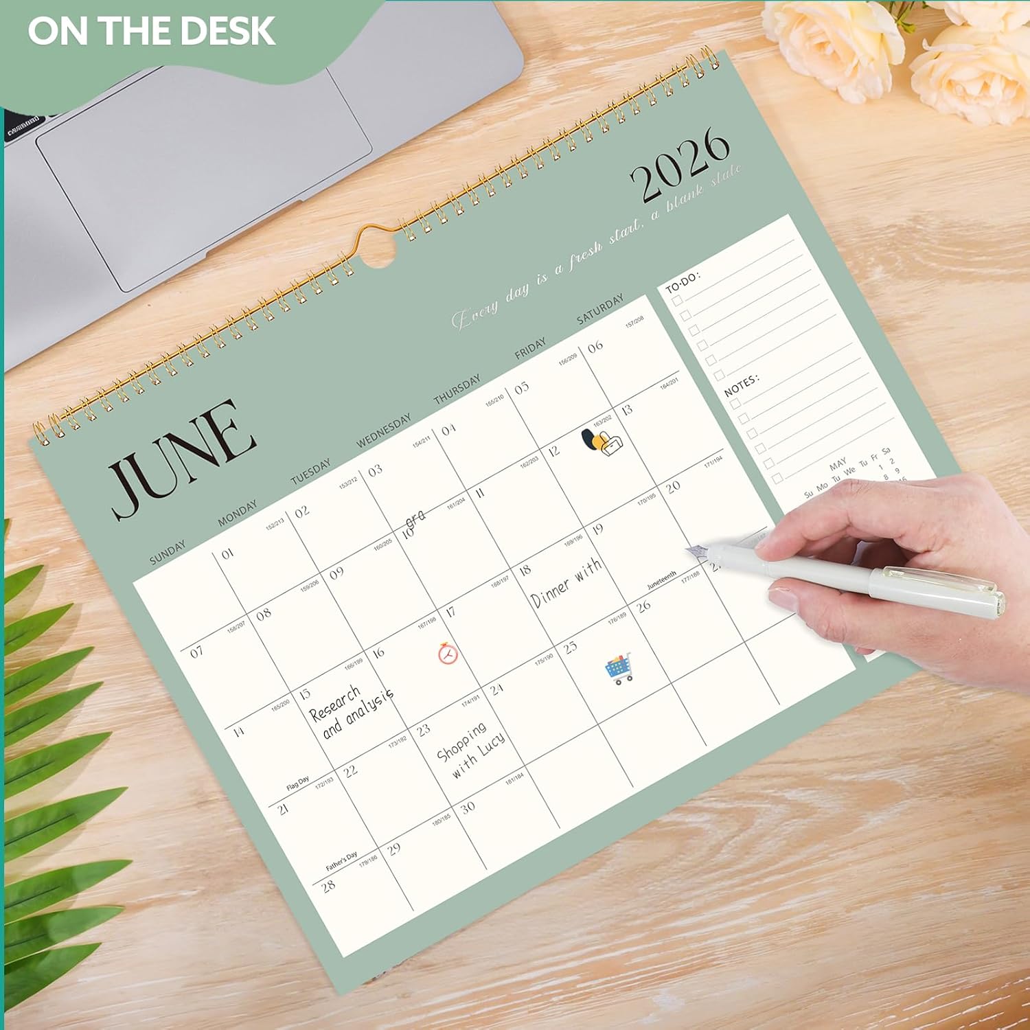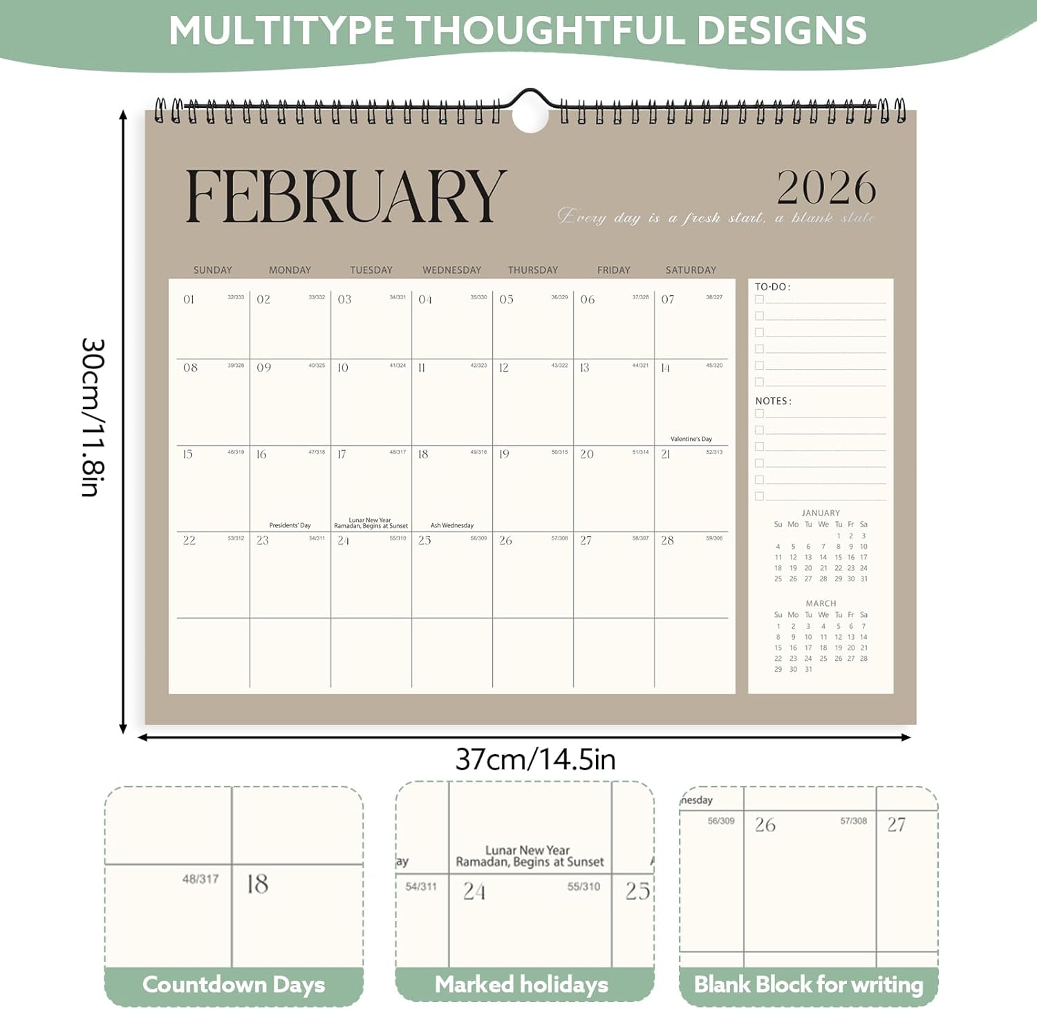 - 【120gsm Paper & Twin-wire Binding】The hanging calendar 2026-2027 is made of 120gsm paper, not easy to bleed and allows smooth writing. The large and clear numbers on the calendar are easy to read. Spiral double-wire binding makes it easy to turn or tear off pages.