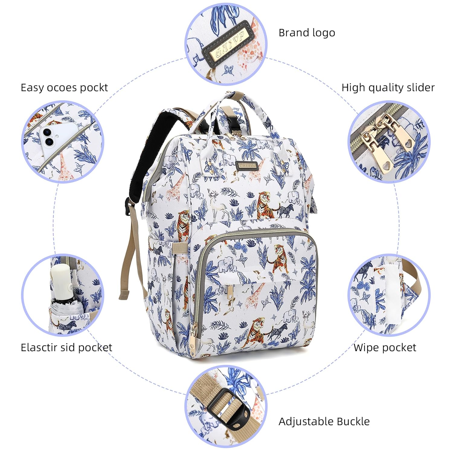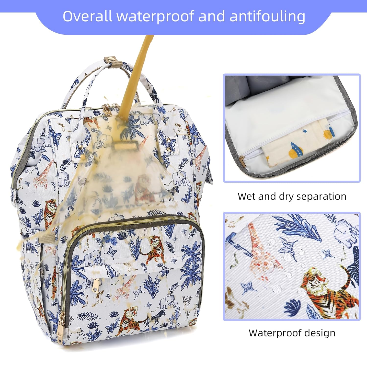 Diaper Bag Backpack, Diaper Bags for Baby Girls Boys, Baby Bags for Moms Dads, Nappy Changing Bag with Insulated Pockets,Multi-functional Waterproof Backpack with Stroller straps-Animal World White
