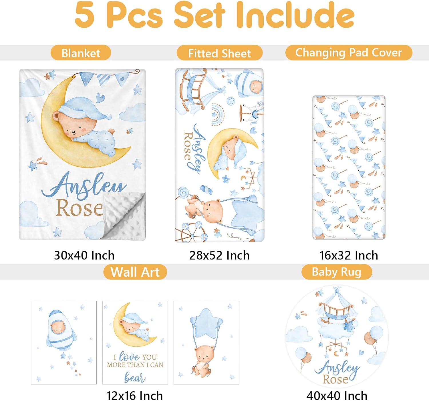 Personalized Baby Crib Bedding Set, 5 Pcs Custom Name Baby Crib Set with Double Layer Blanket, Soft Blue Moon Bear Nursery Bedding Set for Girls Boys, Customized Gifts for Toddlers Infants