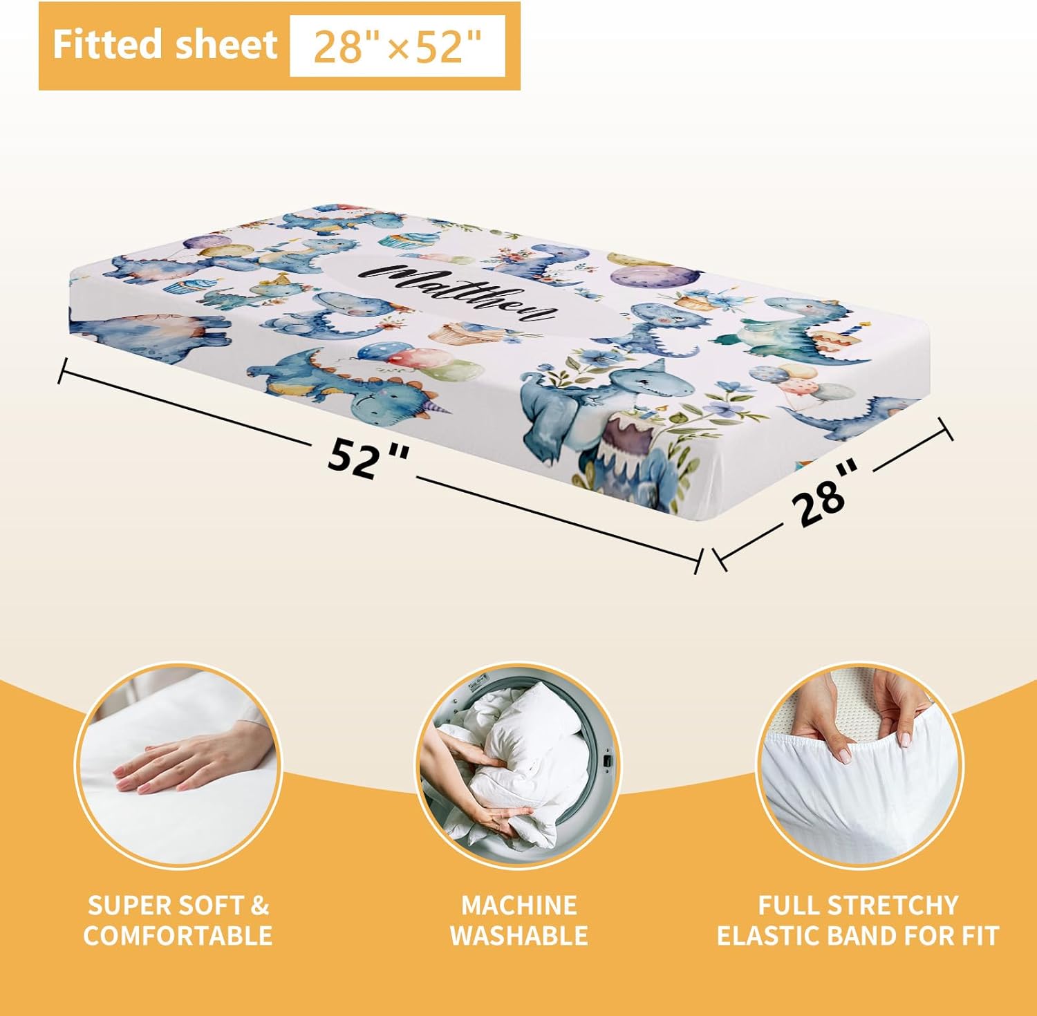 Custom Baby Crib Set - 5 Pcs Personalized Name Blue Dinosaur Crib Bedding Set for Infants Toddlers - Soft Double Layer Nursery Bedding Set for Boys - Customized Gifts for Baby Shower Birthday