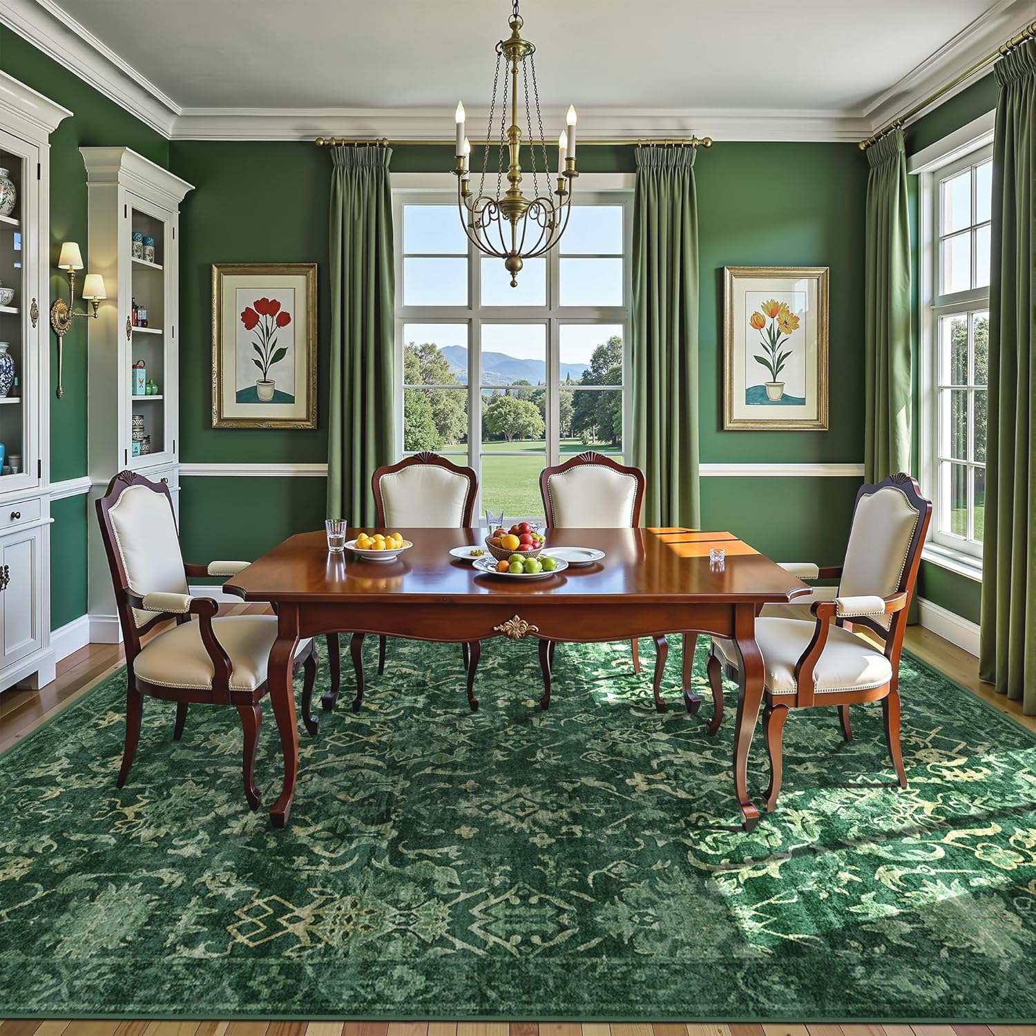 Deerly Dark Green Area Rugs 10x12 for Living Room Soft Non-Slip, Large Bedroom Rug Vintage Dining Room Rug Tribal Farmhouse Carpet for Dining Room Office Green