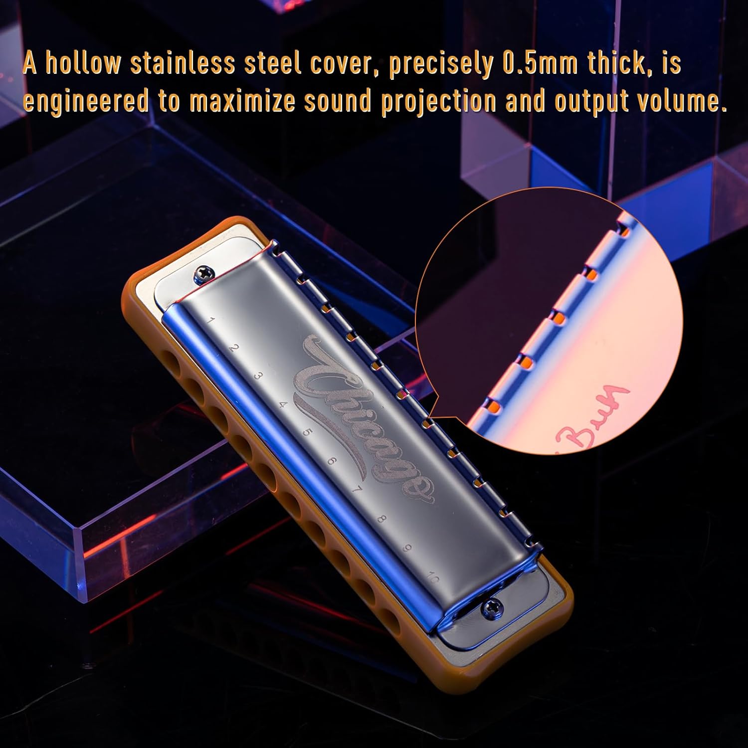 - Premium Sound Projection & Durability: Equipped with a 0.5mm thickened stainless steel cover and hollow design, this harmonica ensures louder volume, even sound distribution, and long-lasting performance. Perfect for both practice and live performances.