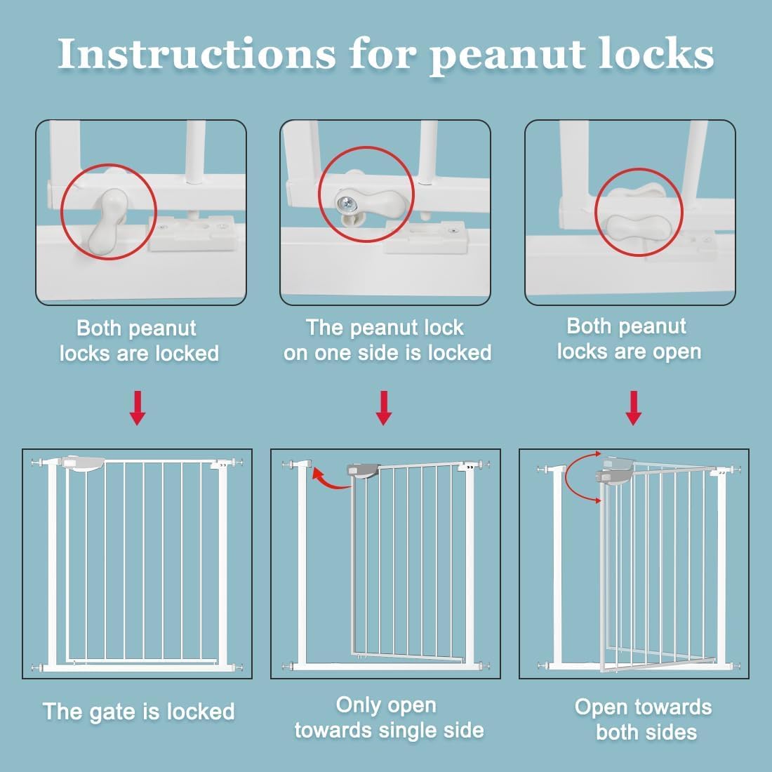 - 【Multiple modes】 Our triple lock gate has various statuses to meet your multiple needs in life. When all three locks are locked, little babies or pets will be stopped by it. At the bottom , there are two peanut locks to control the opening direction and locking. If the peanut lock on one side is locked, the gate can only be opened towards single side. If both peanut locks are open, the gate can swing both ways. Besides, it will stay open at 90 degrees and auto-close when it's less than that