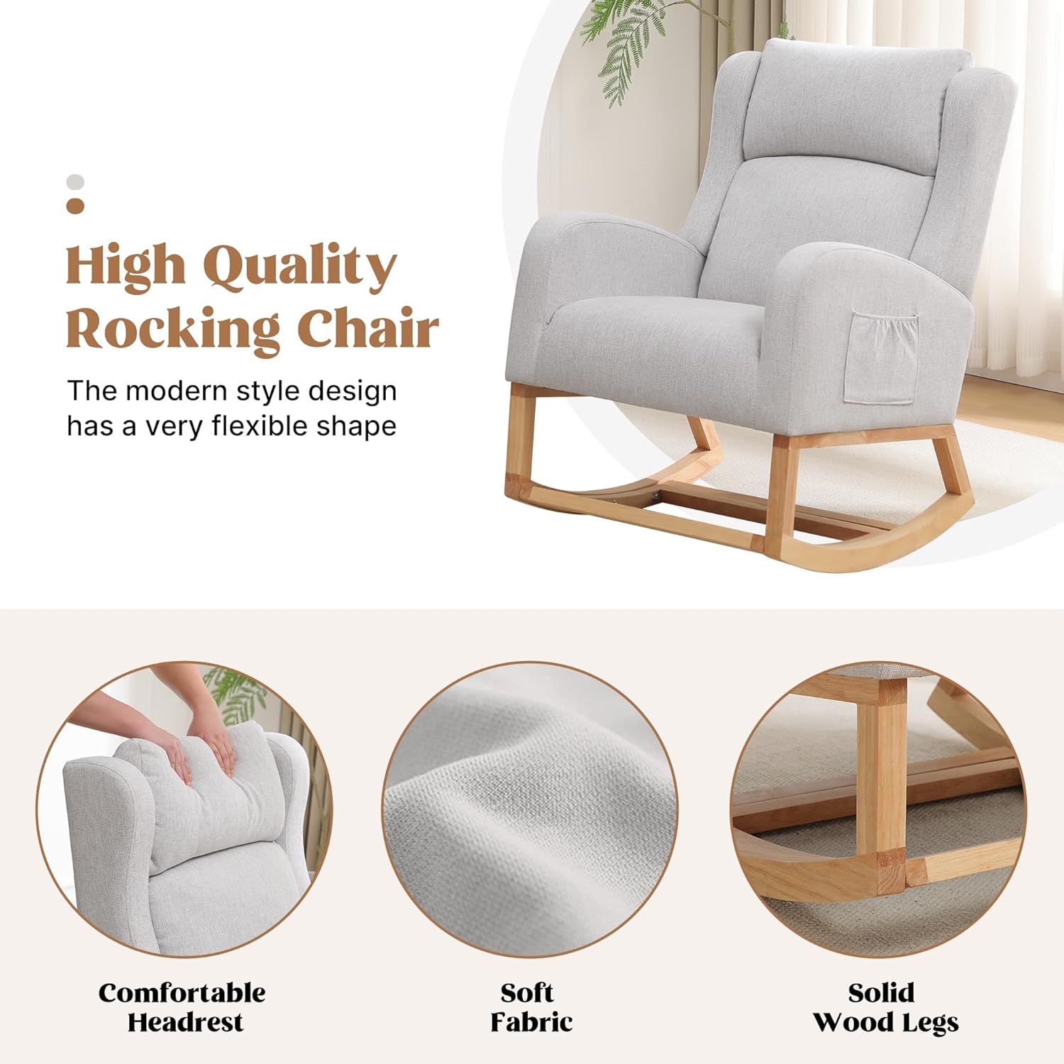 Rocking Chair Nursery, Nursing Rocking Chairs for Mom Nursery, Comfy Wingback Glider Rocking Armchair with Foot Rest and Side Pocket for Nursery Living Room Bedroom, Light Grey
