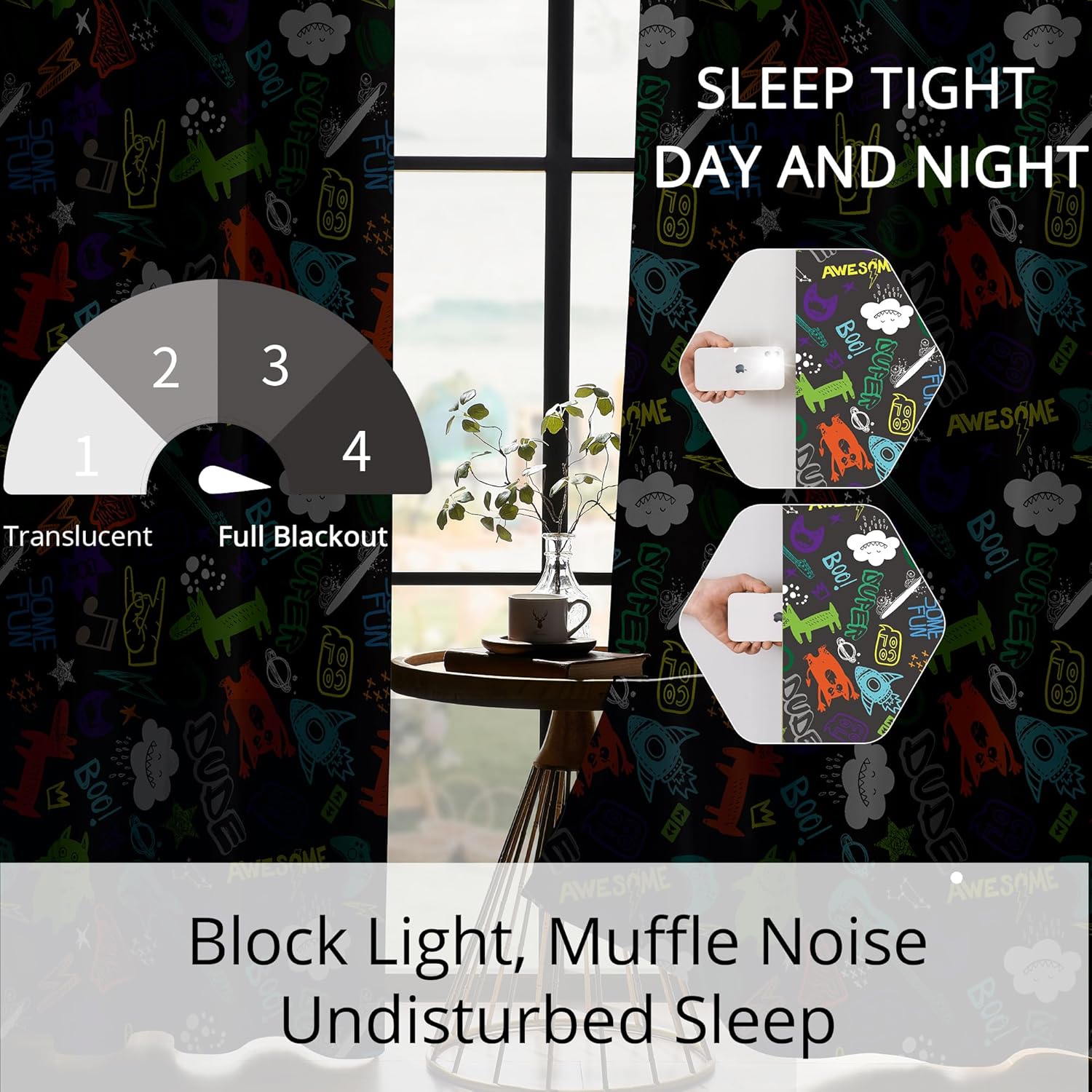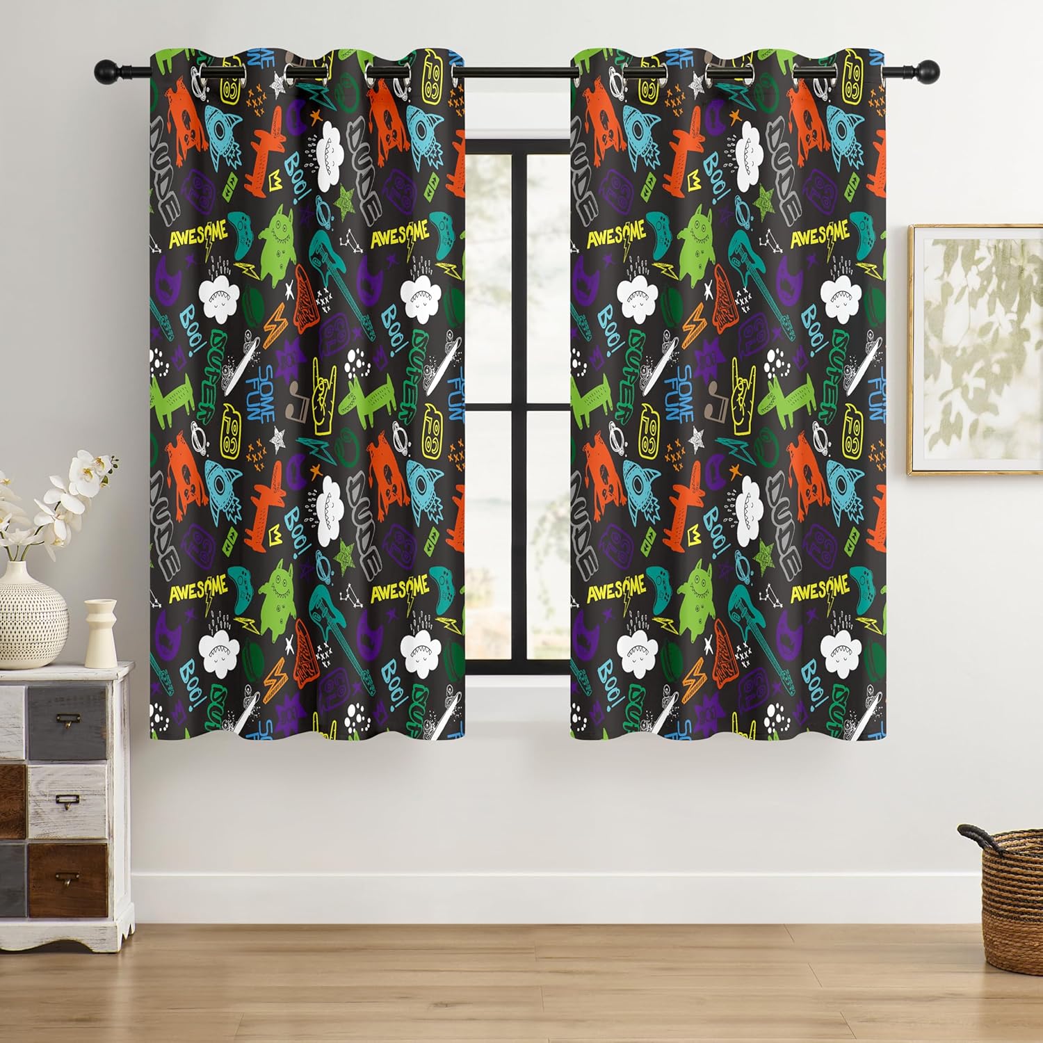 Kids Teen Graffiti Space Blackout Curtains - 100% Blackout, Thermal Insulated, Noise Reducing, Perfect for Kids Room and Nursery, 2 Panels (Graffiti Space Vibes, W52×L63)