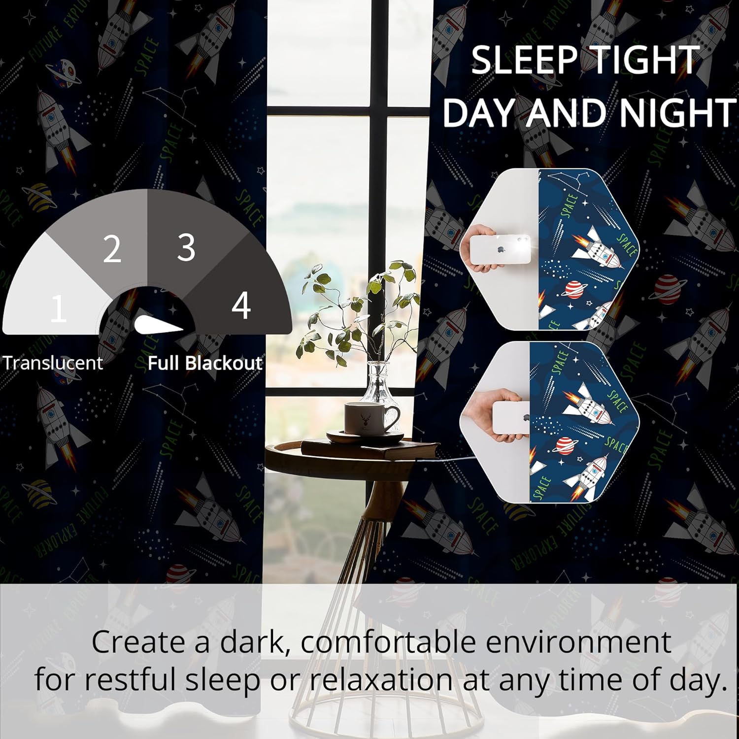 Kids Space Rocket Blackout Curtains - 100% Blackout, Thermal Insulated, Noise Reducing, Perfect for Kids Room and Nursery, 2 Panels (Future Explorer Rockets, W52×L63)