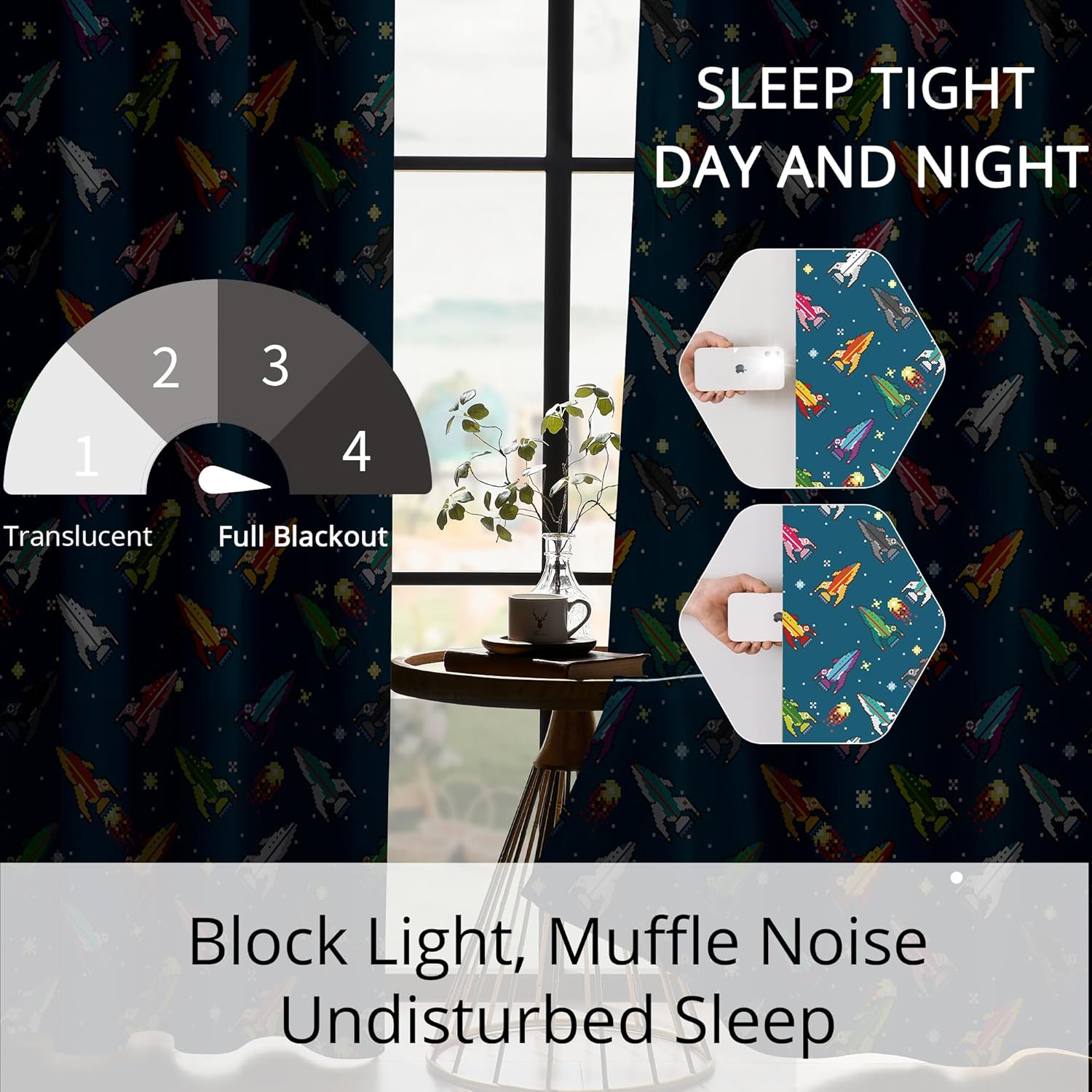 Pixel Rocket Kids Blackout Curtains - 100% Blackout, Thermal Insulated, Noise Reducing, Perfect for Kids Room and Nursery, 2 Panels (Pixel Rocket Fleet, W52×L84)