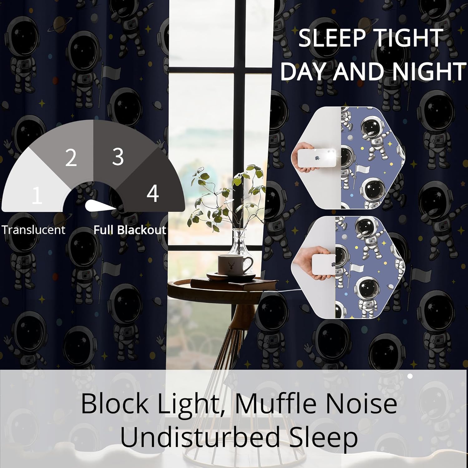 Kids Astronaut Blackout Curtains - 100% Blackout, Thermal Insulated, Noise Reducing, Perfect for Kids Room and Nursery, 2 Panels (Spacewalk Buddies, W52×L84)