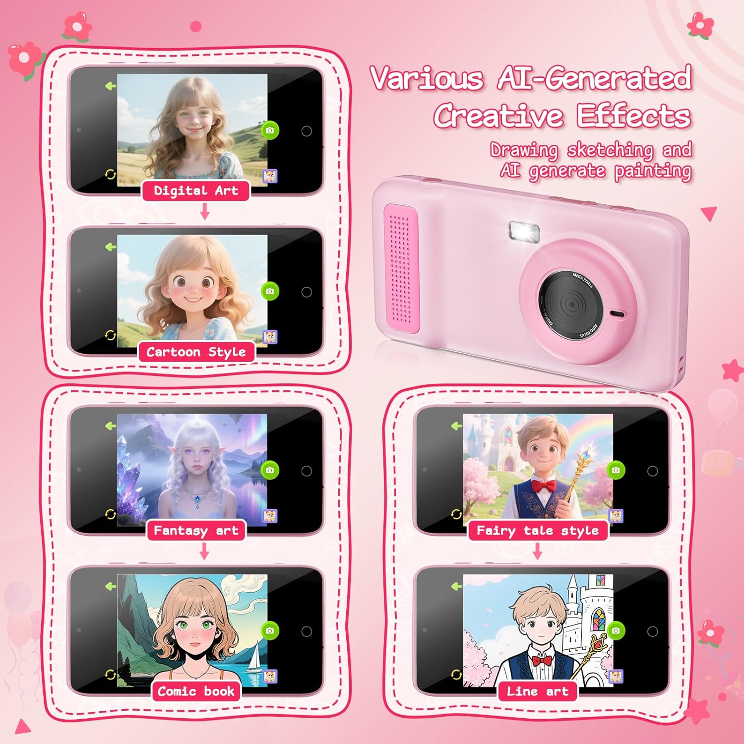 - ▶ AI Kids Digital Camera Toy for Kids:There are 5 types of fun effects configured inside like Portrait Effects,Change Background,Artistic Photos,Hairstyle Effects,Creative Doodle. A fun toy while also improving observation ability,expanding horizons, color sensitivity and cultivate aesthetic appreciation for kids.