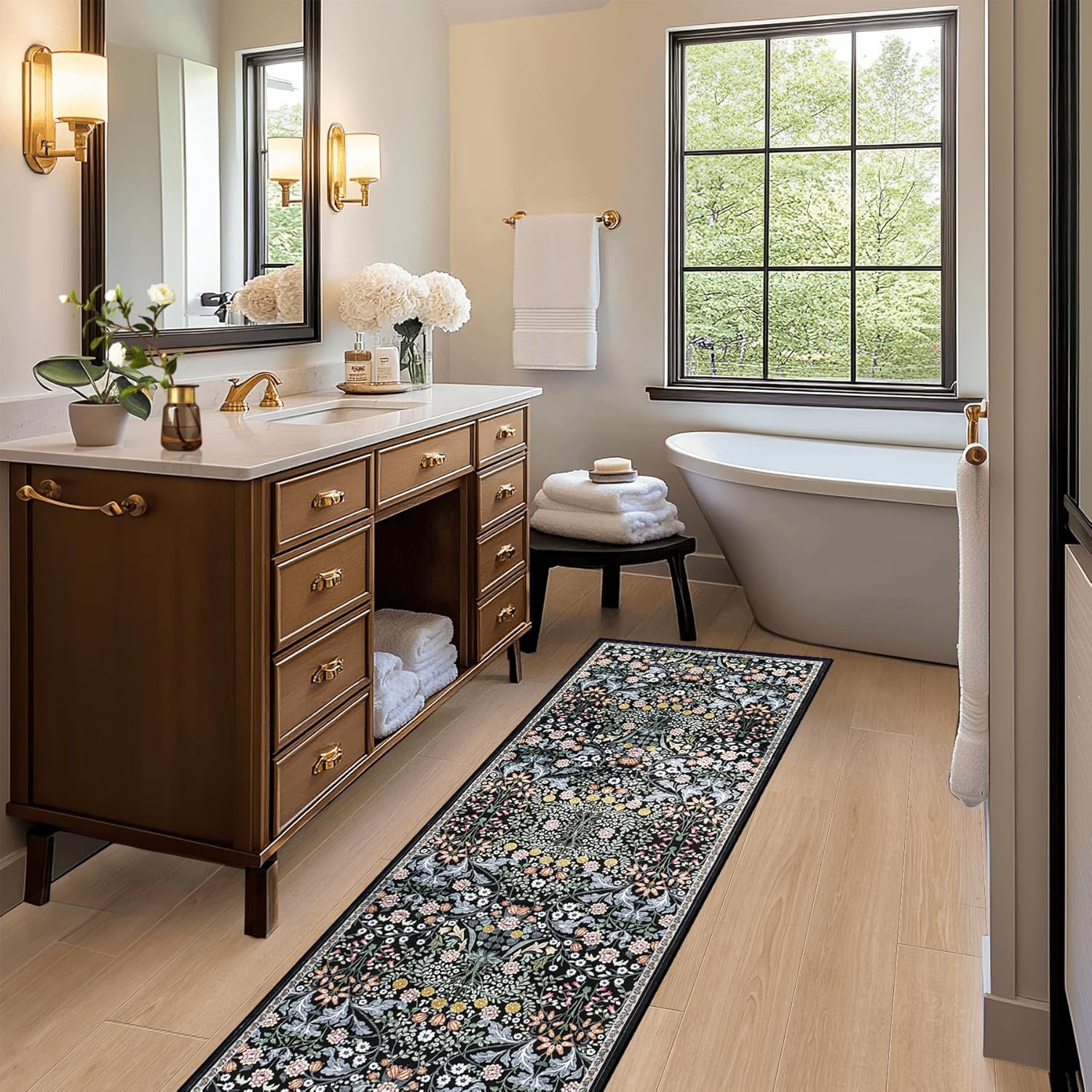 - Elegant Floral Rug: This runner rug vintage-inspired botanical rug blends rich dark black, vibrant and delicate floral complements any decor style, from vintage and bohemian to farmhouse and modern. Perfect rugs for Entryway, Bedroom, Kitchen, Laundry, Bathroom, kids' playrooms, Hallway or home offices, it adds warmth and charm to any space. Both durable and stylish, it withstands high-traffic areas while maintaining a cozy, inviting appeal