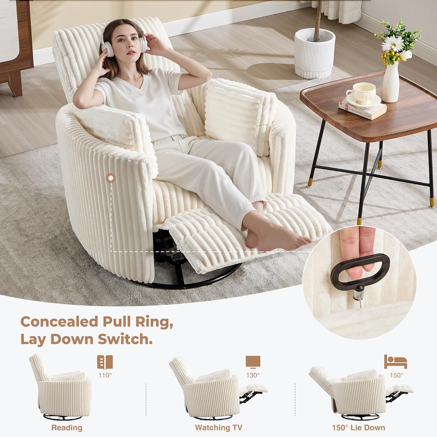 Recliner 360°Swivel Glider Rocking Chair, Upholstered Nursery Adult Rocking Chair with 2 Pillows for Living Room Bedroom (Beige Corduroy, Manual Operation)